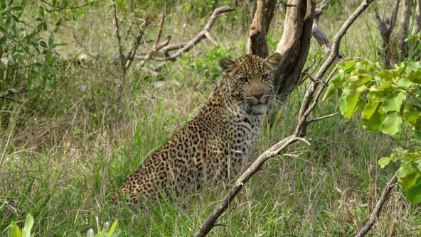 Bereits auf der zweiten Pirschfahrt haben wir dann einen Leoparden gesichtet. Bei solch einer Sichtung bleibt man im Krüger Nationalpark aber nicht das einzige Fahrzeug. Zahlreiche Mietwagen und Safarifahrzeuge tummelten sich auf der Straße und versuchten den besten Blick auf den Leoparden zu erhaschen. Einige Meerkatzen saßen ebenfalls am Straßenrand. Und prompt begann der Leopard die Jagd. Im dichten Gebüsch verpasste ich zwar die Jagdszene selbst, konnte dann aber erkennen, dass der Leopard erfolgreich war und eine Meerkatze gefangen hat.