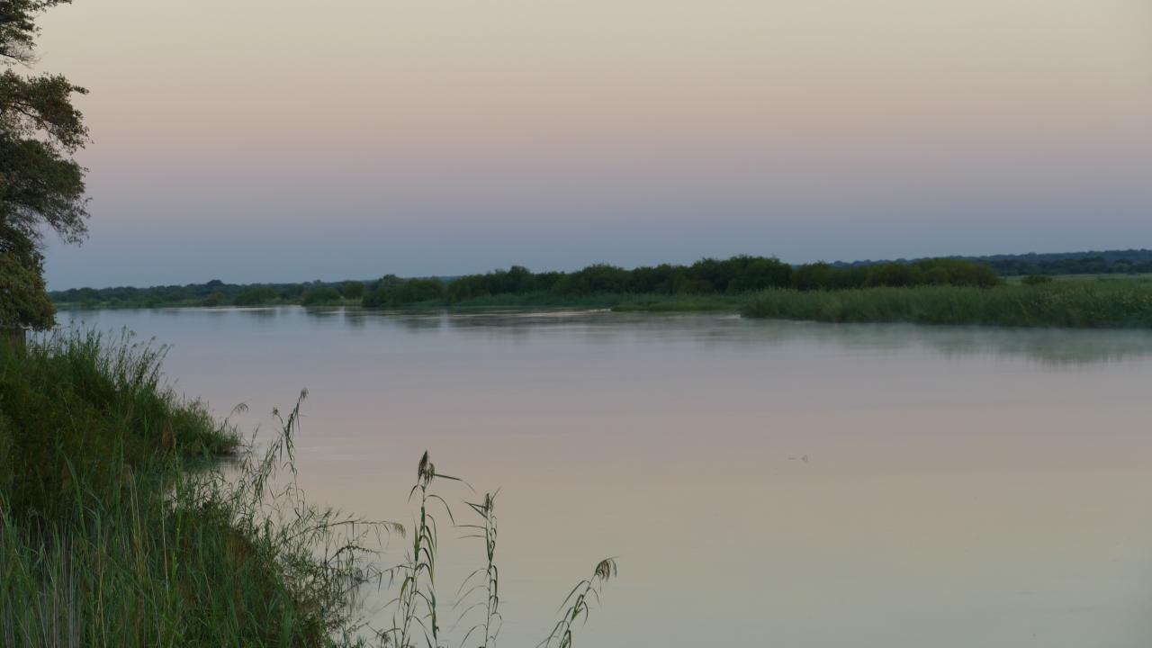 Die letzten Kilometer zur Hakusembe River Lodge bringen uns durch Schwemmland, erste Teiche mit Seerosen erfreuen unser Auge. Erst an der Unterkunft sehen wir den breiten Kavango-Fluss. Unser Bungalow liegt direkt an dessen Ufer. Von der Terrasse genießen wir den Ausblick. Am anderen Ufer des Flusses liegt Angola. Fischer in Einbäumen angeln mit kleinen Netzen und Reusen im seichten Wasser. Zu unserem (späten, frühnachmittäglichen) Mittagessen gibt es Fisch. Wir genießen den Flussblick vom Deck über das Schilf hinweg, anschließend eine willkommene Abkühlung im Pool und melden uns zur Sunset Cruise an.