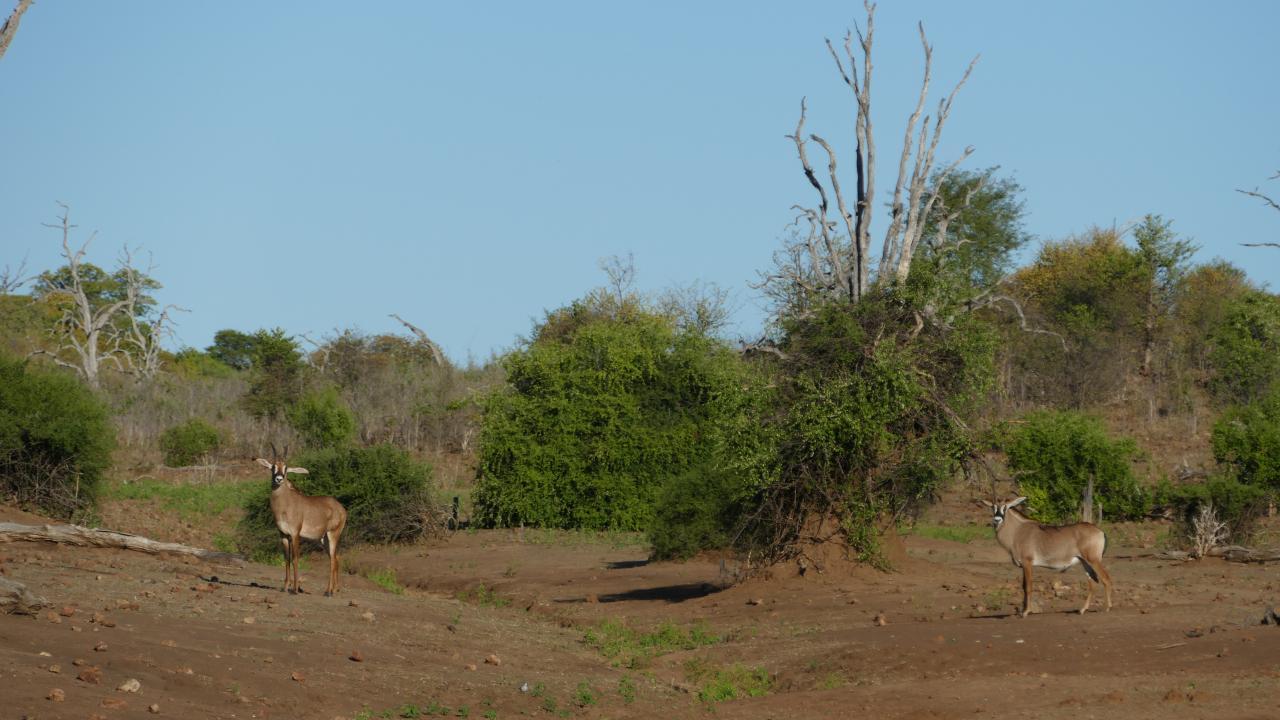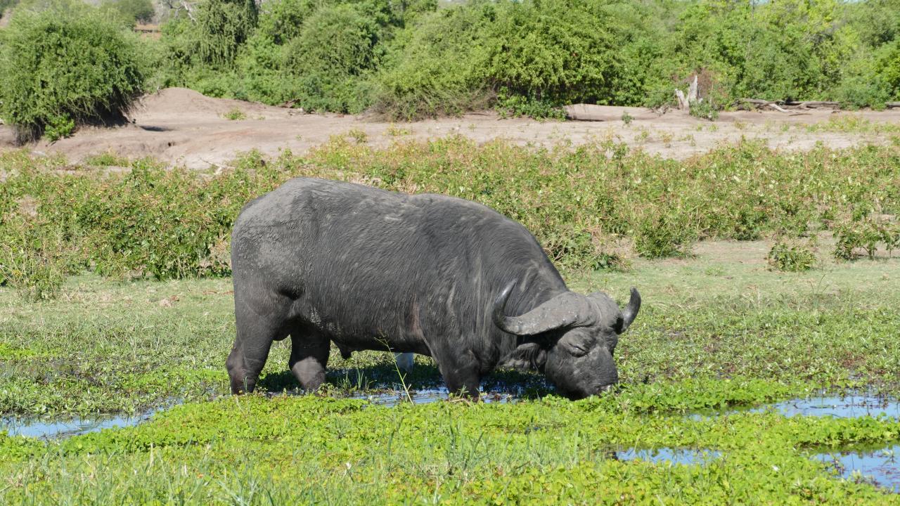 Über die Piste rennt eine Rappenantilope, die innerhalb weniger Sekunden, im grünen Dickicht verschwindet. Offener wird die Landschaft, als wir zur Überschwemmungsebene des Flusses kommen. Riesige Flächen sind von Seerosen bedeckt, Lechwe-Antilopen stehen im flachen Wasser und in der Entfernung sehen wir Flusspferde und Büffel, die sich das frische Grün schmecken lassen. Während der Fahrt am Kavango-Fluss entlang passieren wir immer wieder mehr oder weniger tiefe Pfützen, das Wasser spritzt von den Reifen in die Höhe. Wir beobachten Buschböcke, Wasservögel, Warane und eine weitere Rappenantilope.