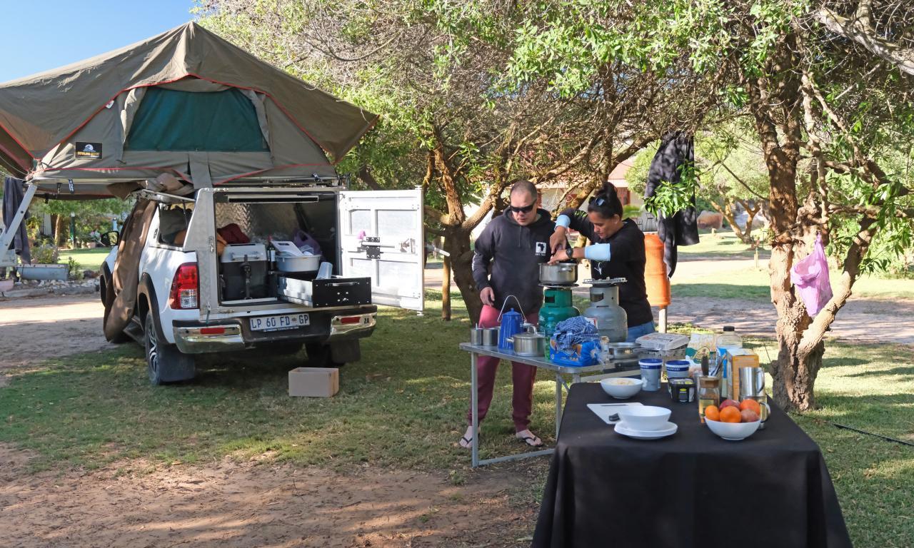 Ü: im Dachzelt auf dem Campingplatz der Chobe Safari Lodge mit gemeinschaftlichen sanitären Anlagen.