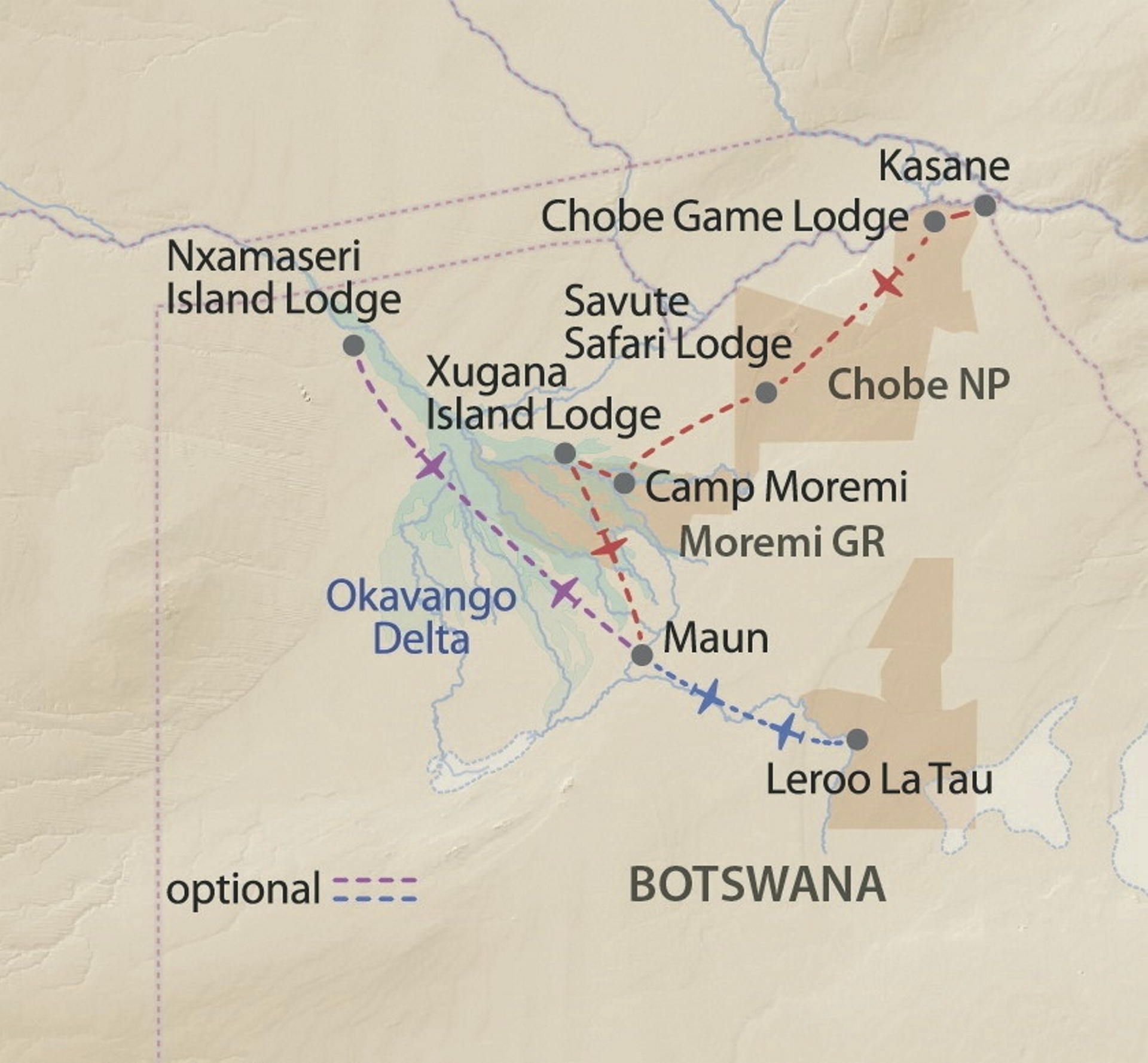 Nach erlebnisreichen Tagen im Okavango Delta fliegen Sie zurück nach Maun, wo die Flugsafari planmäßig endet (Flugzeit ca. 30 Minuten). Für Gäste, die das Abenteuer verlängern möchten, gibt es zwei attraktive Optionen für weitere Safari-Erlebnisse: Leroo La Tau: Ein Exklusives Camp an der Grenze zum Makgadikgadi Pans Nationalpark, ideal für Pirschfahrten in einem einzigartigen Übergangsgebiet zwischen Savanne und Salzpfannen. Nxamaseri Island Lodge: Idyllisch gelegen im Okavango Panhandle, perfekt für weitere Safari-Aktivitäten sowie der Besuch der Tsodilo Hills im nördlichen Delta. 2 Ü: Leroo La Tau oder Nxamaseri Island Lodge.