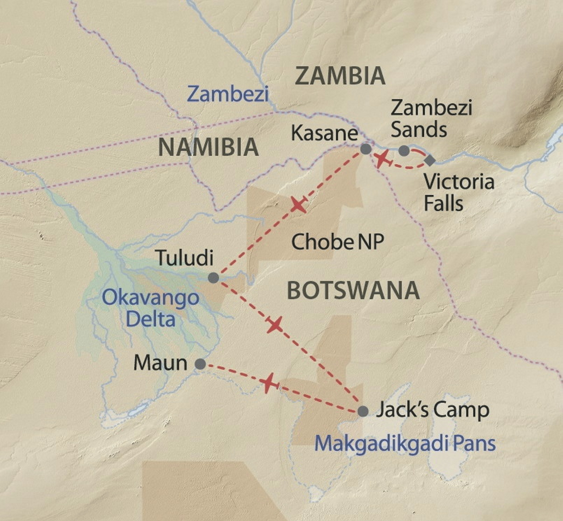 - Victoria Wasserfälle, Khwai und die Makgadikgadi Salzpfannen