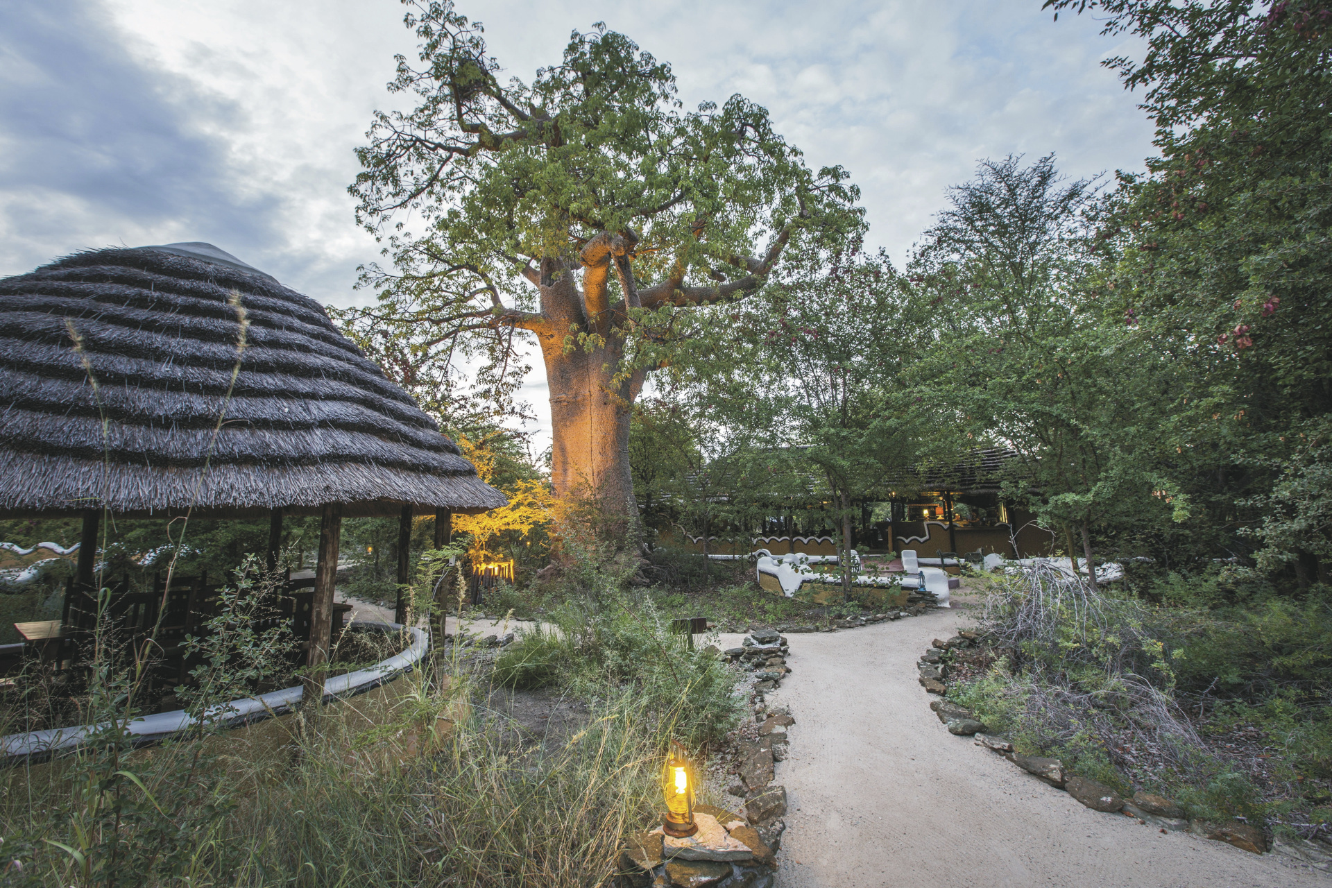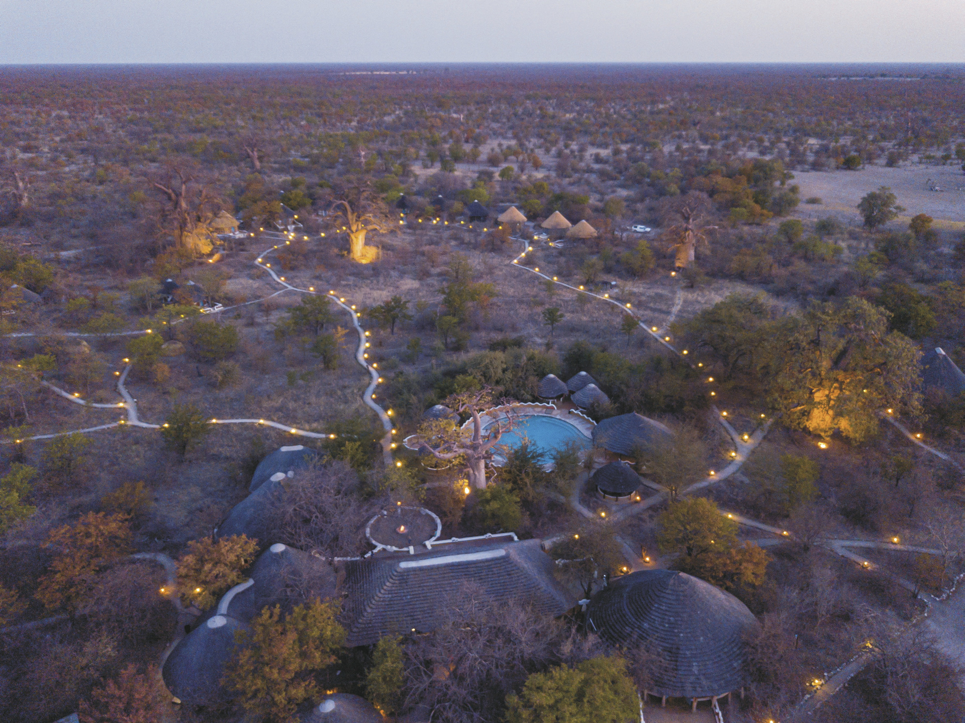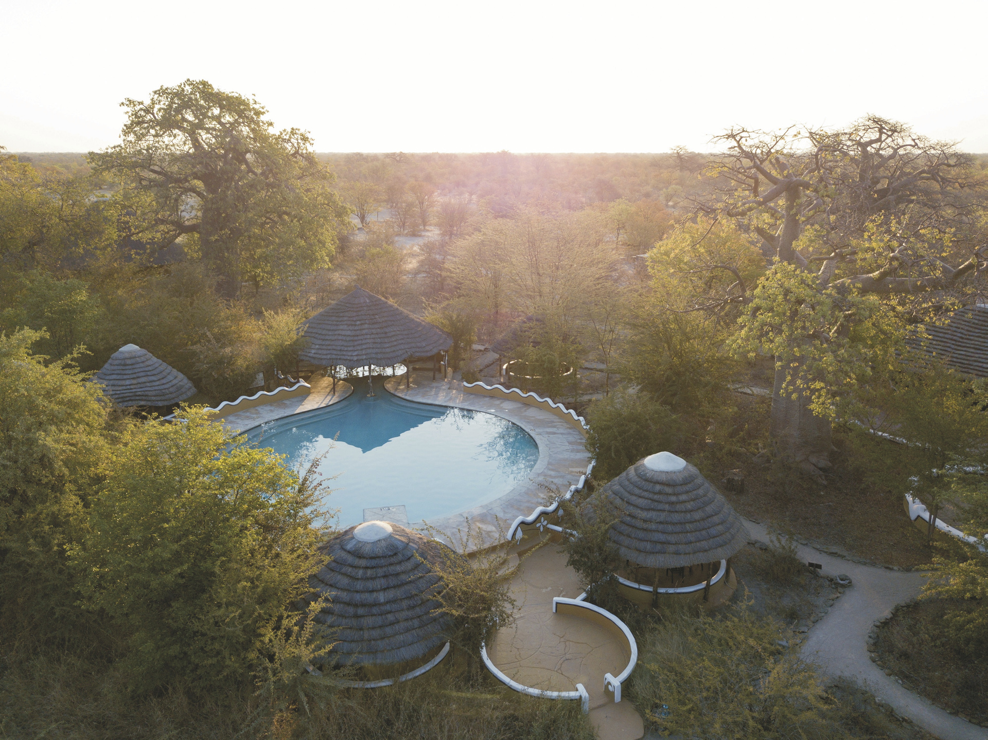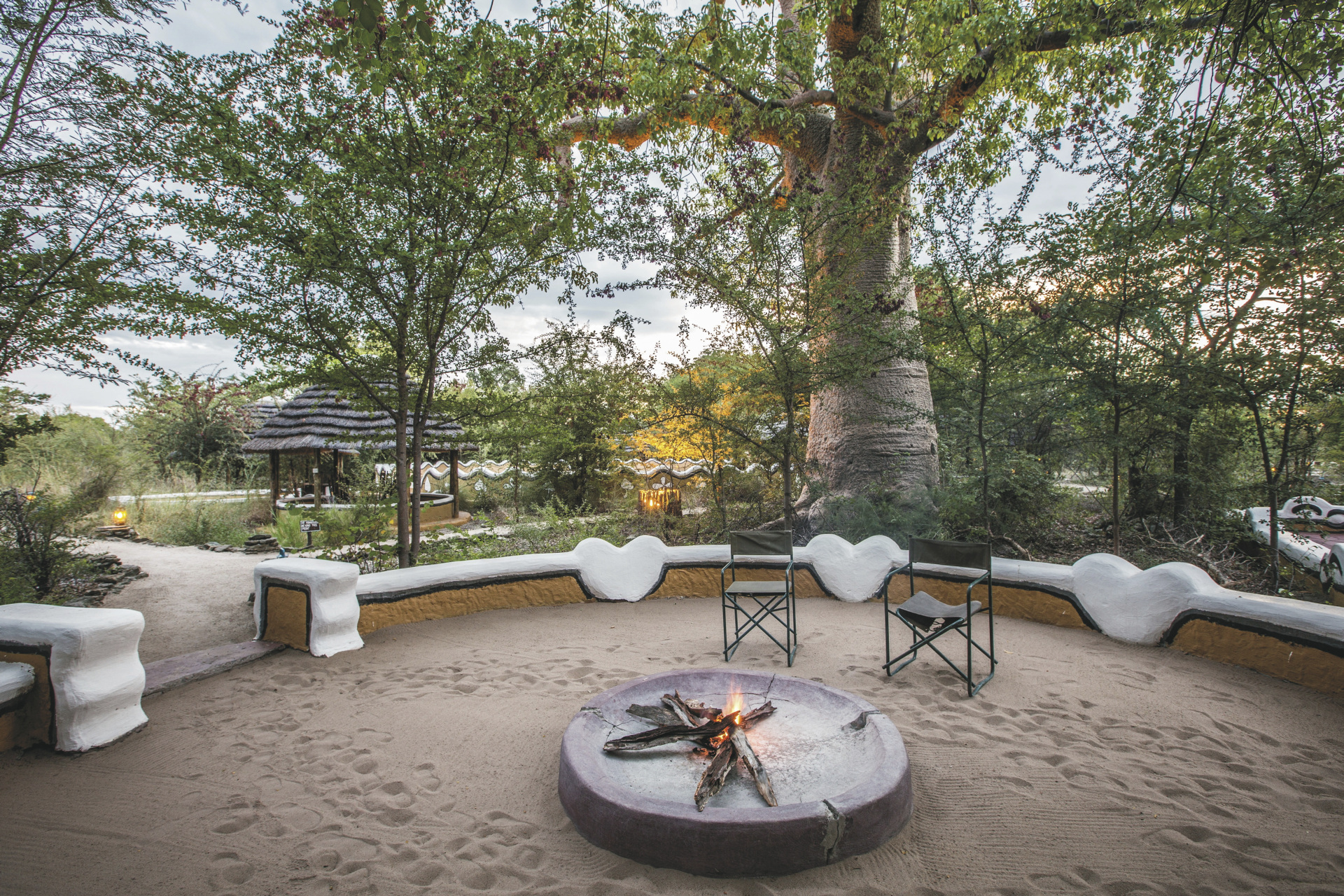Verteilt unter einer Gemeinschaft von riesigen Affenbrotbäumen orientieren sich die 18 strohgedeckten Bungalows (davon 3 Familien-Bungalows) stark an den Dörfern Botswanas und sind alle in Gruppen angeordnet. Lebendige Wandmalereien zieren die Außenwände und im Inneren sind sonnige Patchwork-Decken und eine Vielzahl an Accessoires zu finden. Die Bungalows haben zwei Betten auf beiden Seiten des Raumes und die Familien-Bungalows ein großes Doppelbett in der Mitte und zwei Einzelbetten an den Seiten, alle mit eigenem Bad/DU/WC und elektrischem Licht.