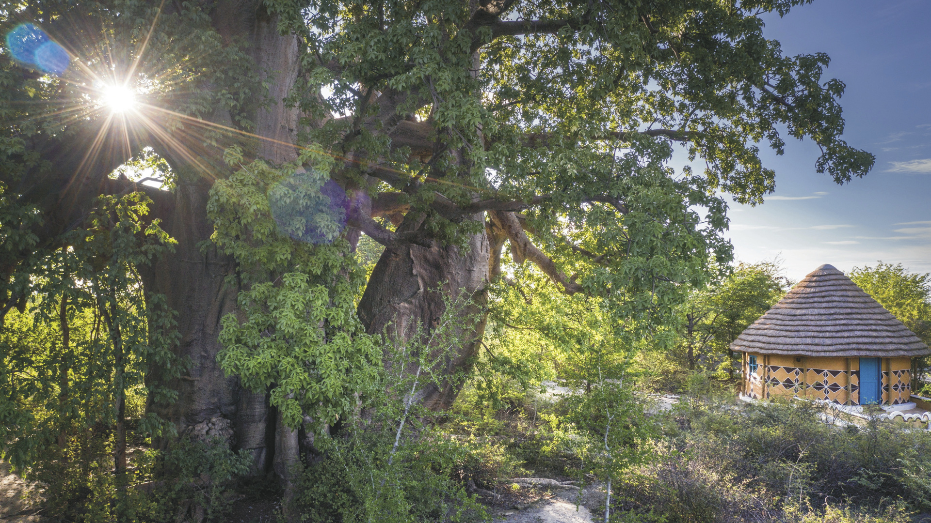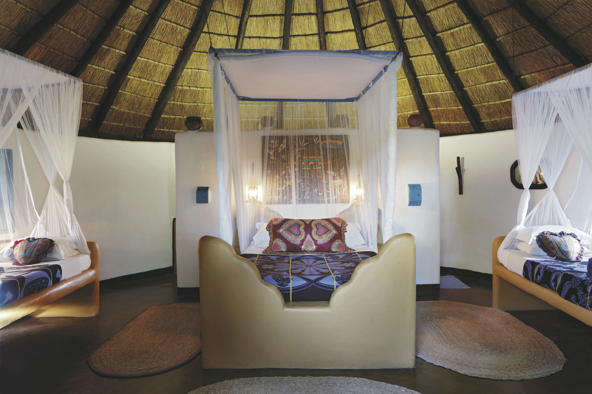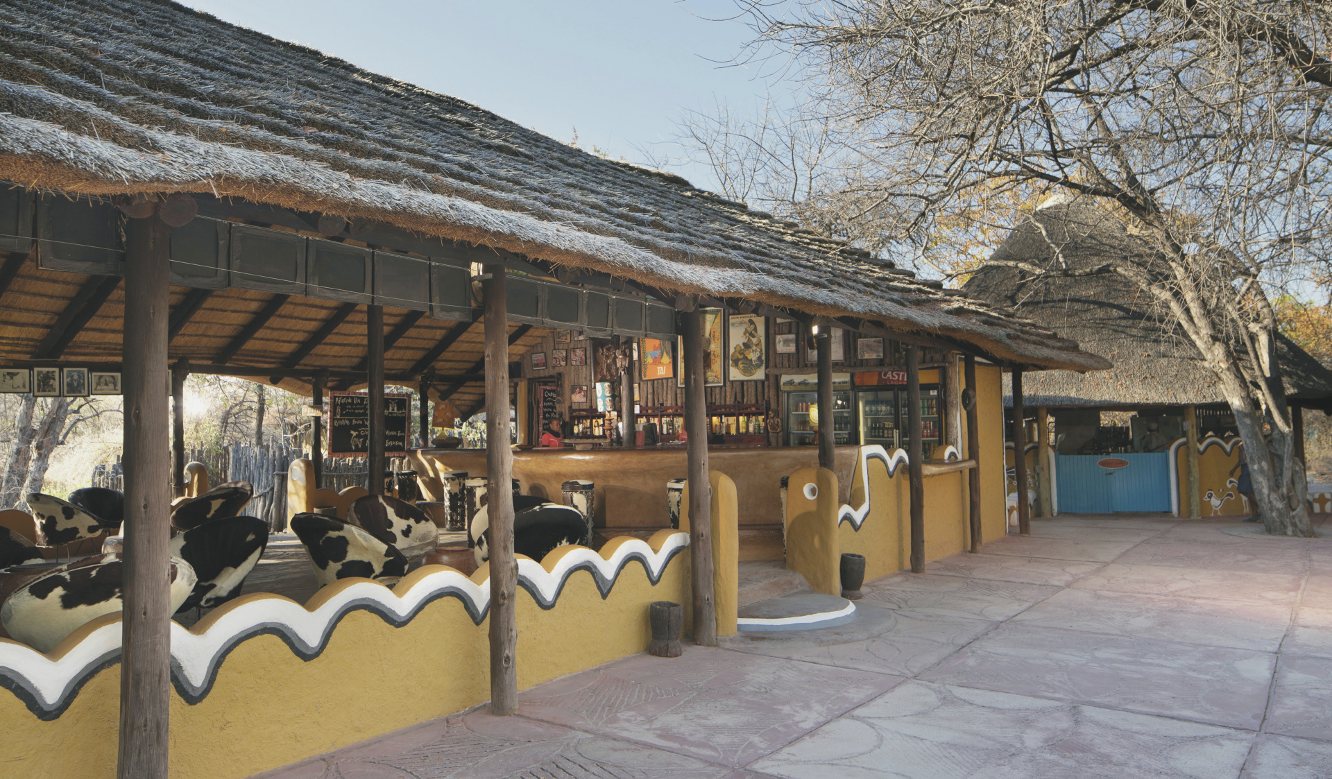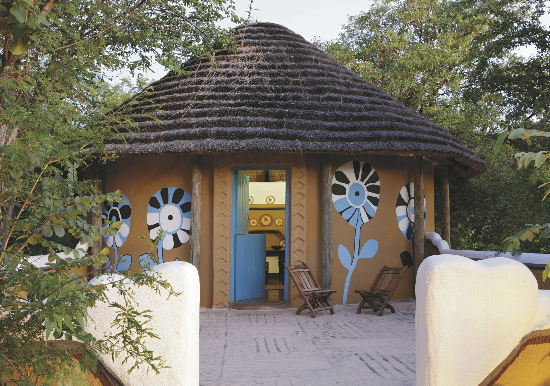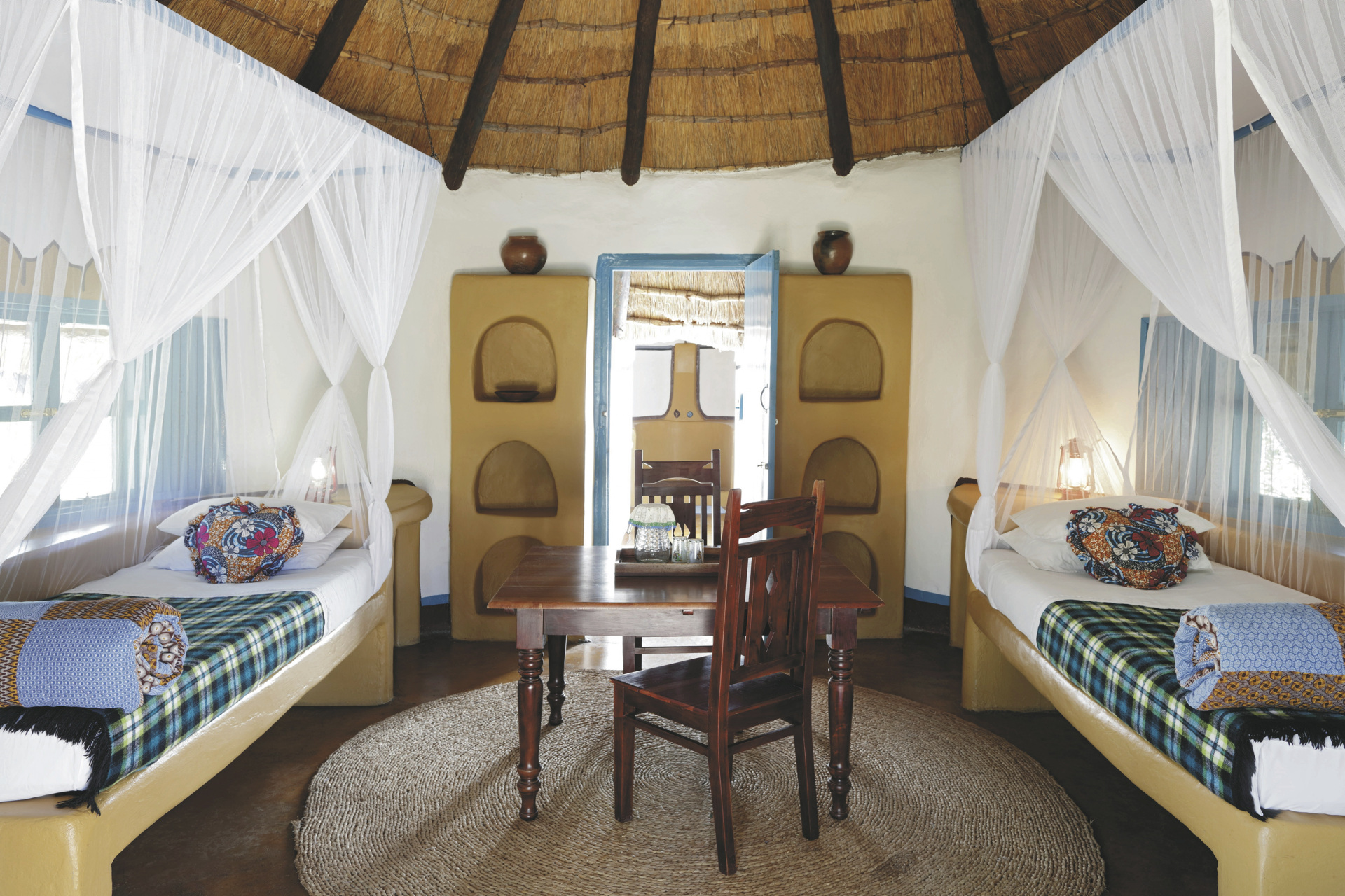 Verteilt unter einer Gemeinschaft von riesigen Affenbrotbäumen orientieren sich die 18 strohgedeckten Bungalows (davon 3 Familien-Bungalows) stark an den Dörfern Botswanas und sind alle in Gruppen angeordnet. Lebendige Wandmalereien zieren die Außenwände und im Inneren sind sonnige Patchwork-Decken und eine Vielzahl an Accessoires zu finden. Die Bungalows haben zwei Betten auf beiden Seiten des Raumes und die Familien-Bungalows ein großes Doppelbett in der Mitte und zwei Einzelbetten an den Seiten, alle mit eigenem Bad/DU/WC und elektrischem Licht.