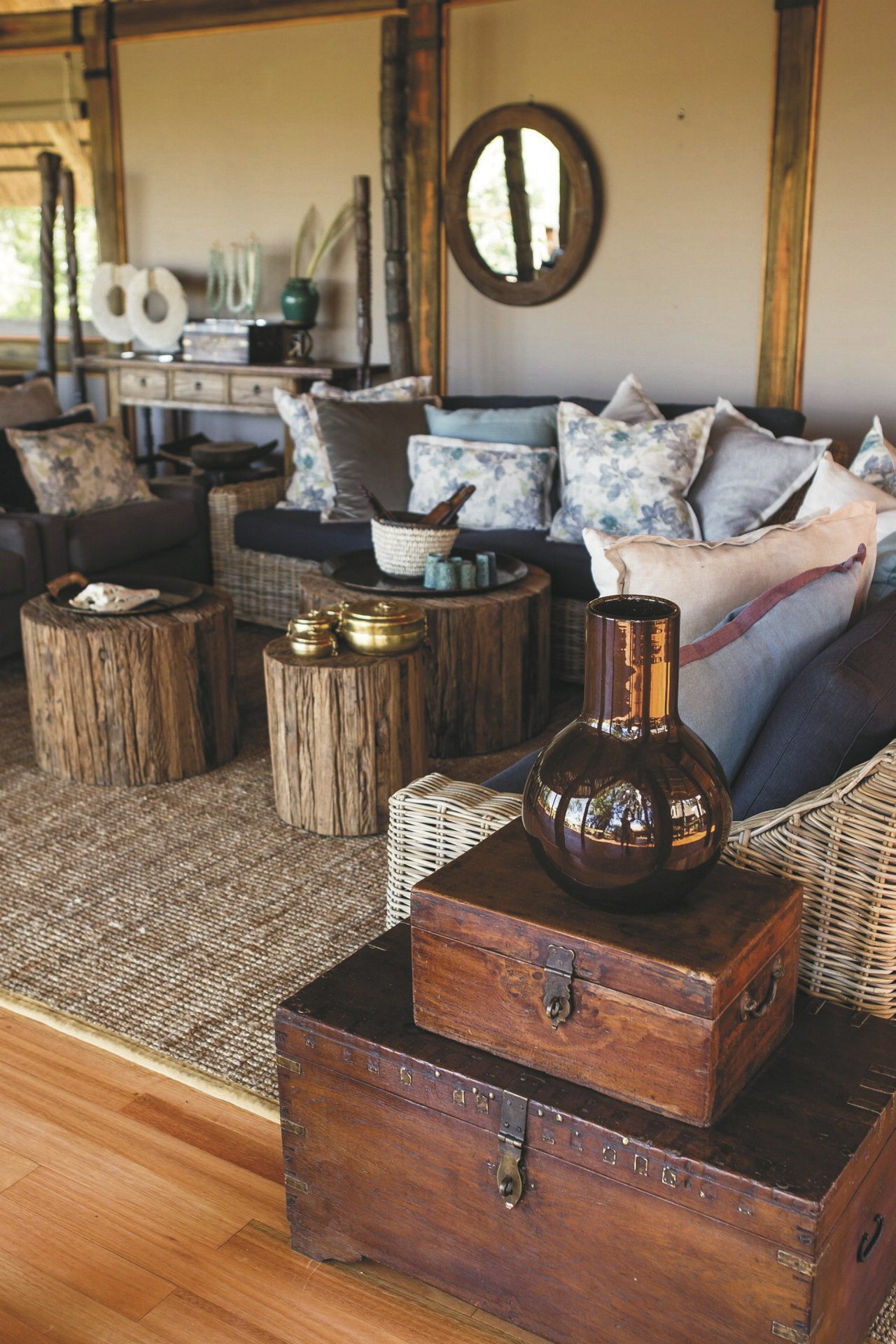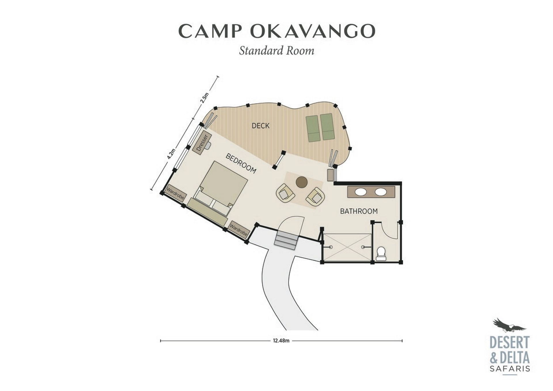Der Hauptbereich des Camp Okavango besteht aus einem Netzwerk von miteinander verbundenen Gehwegen, die zwei Lounge-Bereiche, einen Speisebereich, eine Bibliothek, eine Selbstbedienungsbar und einen Souvenirladen miteinander verbinden. Sanfte Rampen führen zur unteren Terrasse mit zwei Feuerstellen und bequemen Sitzbereichen, die zum Entspannen und Genießen der natürlichen Umgebung einladen. Es gibt eine dritte Terrasse mit einem Pool und einem strohgedeckten Lounge-Bereich für die warmen Sommertage.