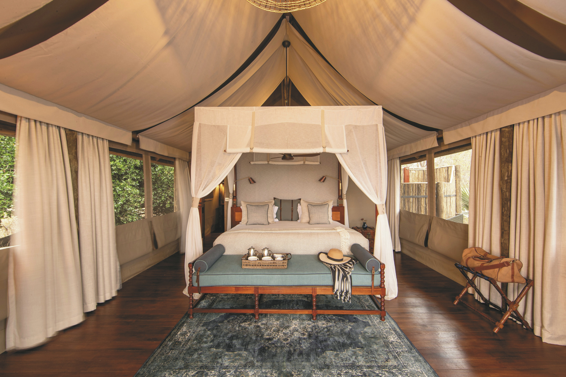 Jedes der 8 Zelte verfügt über ein großes Schlafzimmer und ein eigenes Bad mit Innen- und Außendusche. Für jeden erdenklichen Komfort ist gesorgt - von Solarstrom, Stand- und Deckenventilatoren bis hin zu Yogamatten und Haartrocknern! Familien werden in einem speziell angefertigten Familienzelt mit zwei Schlafzimmern und eigenem Bad für maximal 5 Personen untergebracht.