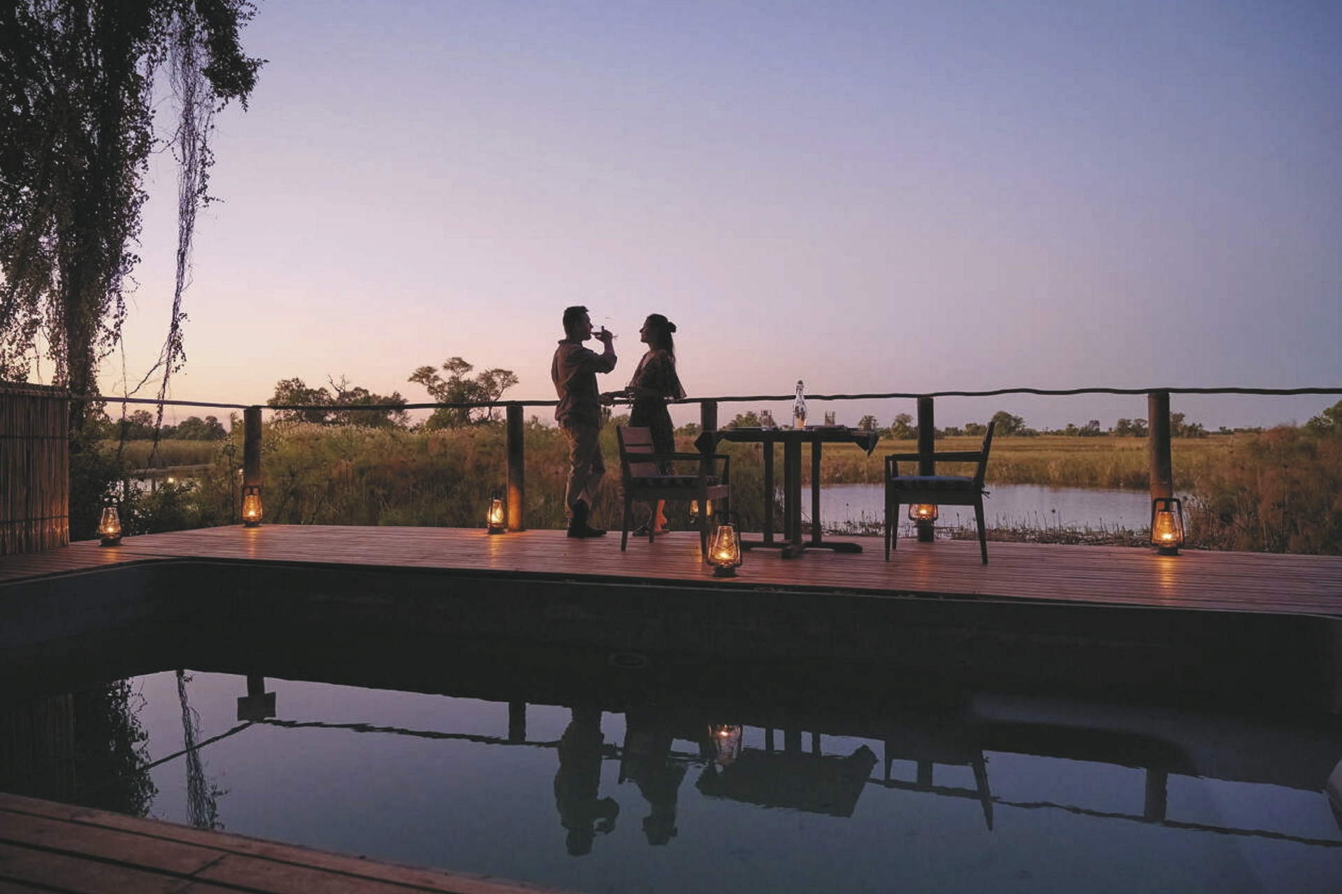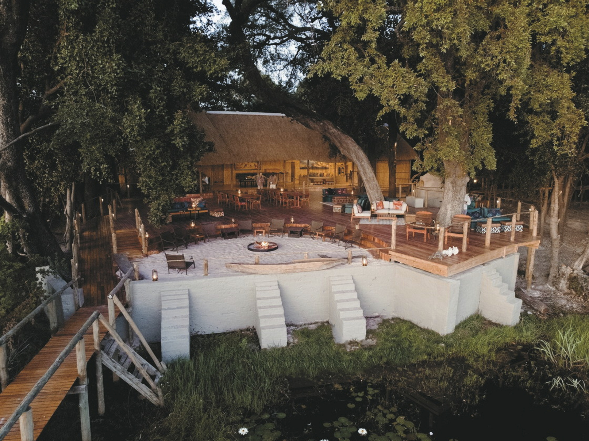 Die kleine, exklusive Lodge ist eine der ältesten im Okavango Delta. Das von lokalen Handwerkern handgefertigte Dekor und originale botswanische Kunstwerke verleihen der Lodge einen rustikalen, natürlichen Charme. Im Hauptbereich befindet sich eine Lounge mit Bar und der Essensbereich. Außerdem gibt es einen kleinen Swimming Pool. Am Abend genießt man die Ruhe bei einem Lagerfeuer auf der Terrasse mit Blick über den Okavango Fluss.