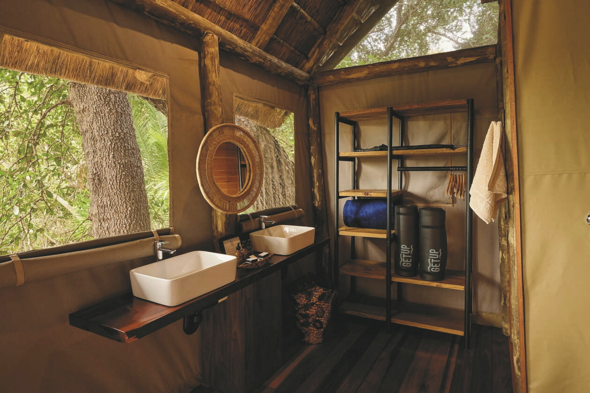 Die einzeln stehenden Chalets mit Zeltwänden sind auf Holzplattformen errichtet und über Holzstege mit dem Hauptbereich der Lodge verbunden. Sie verfügen über eine kleine Veranda sowie Bad mit Dusche/WC.
