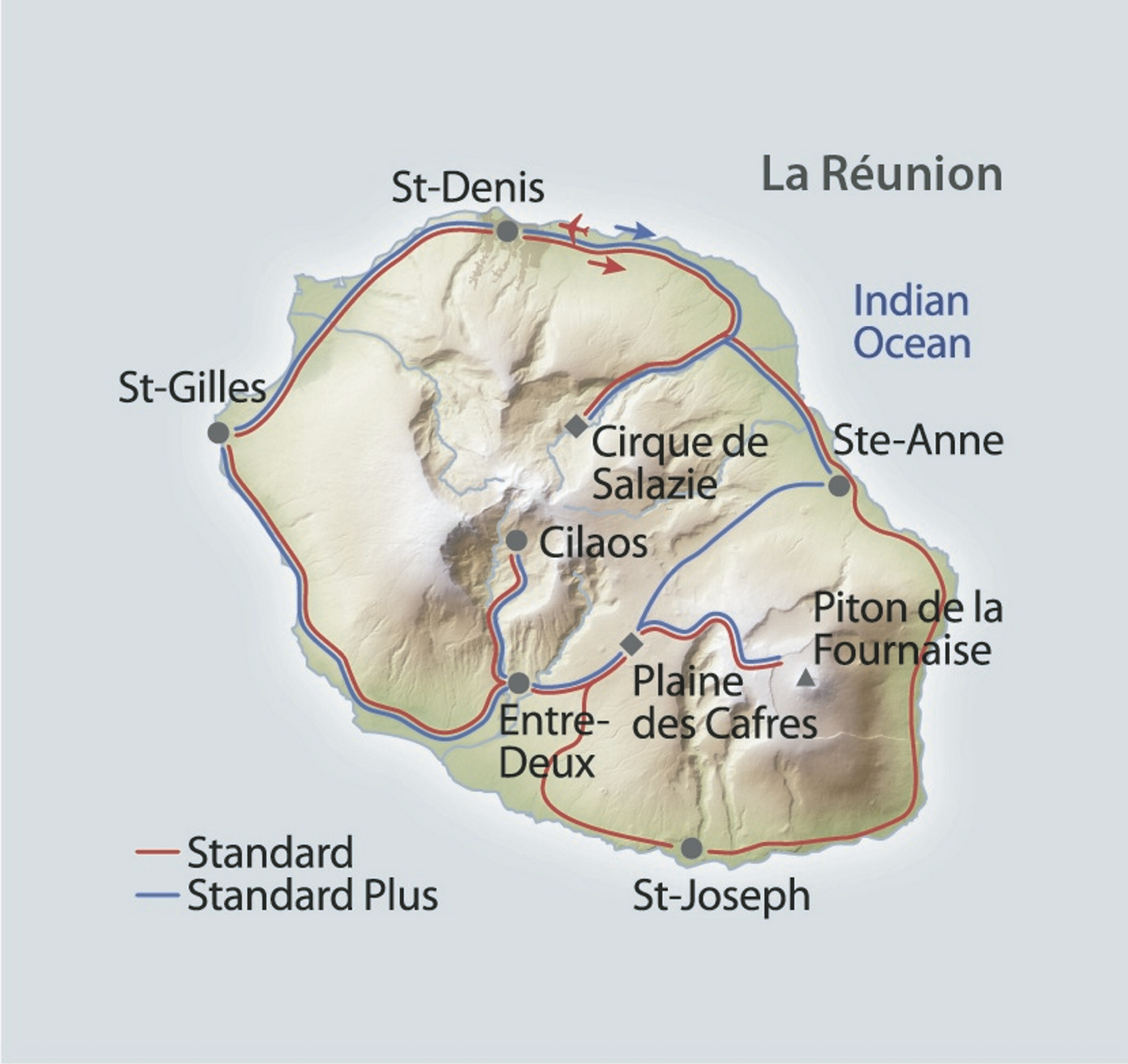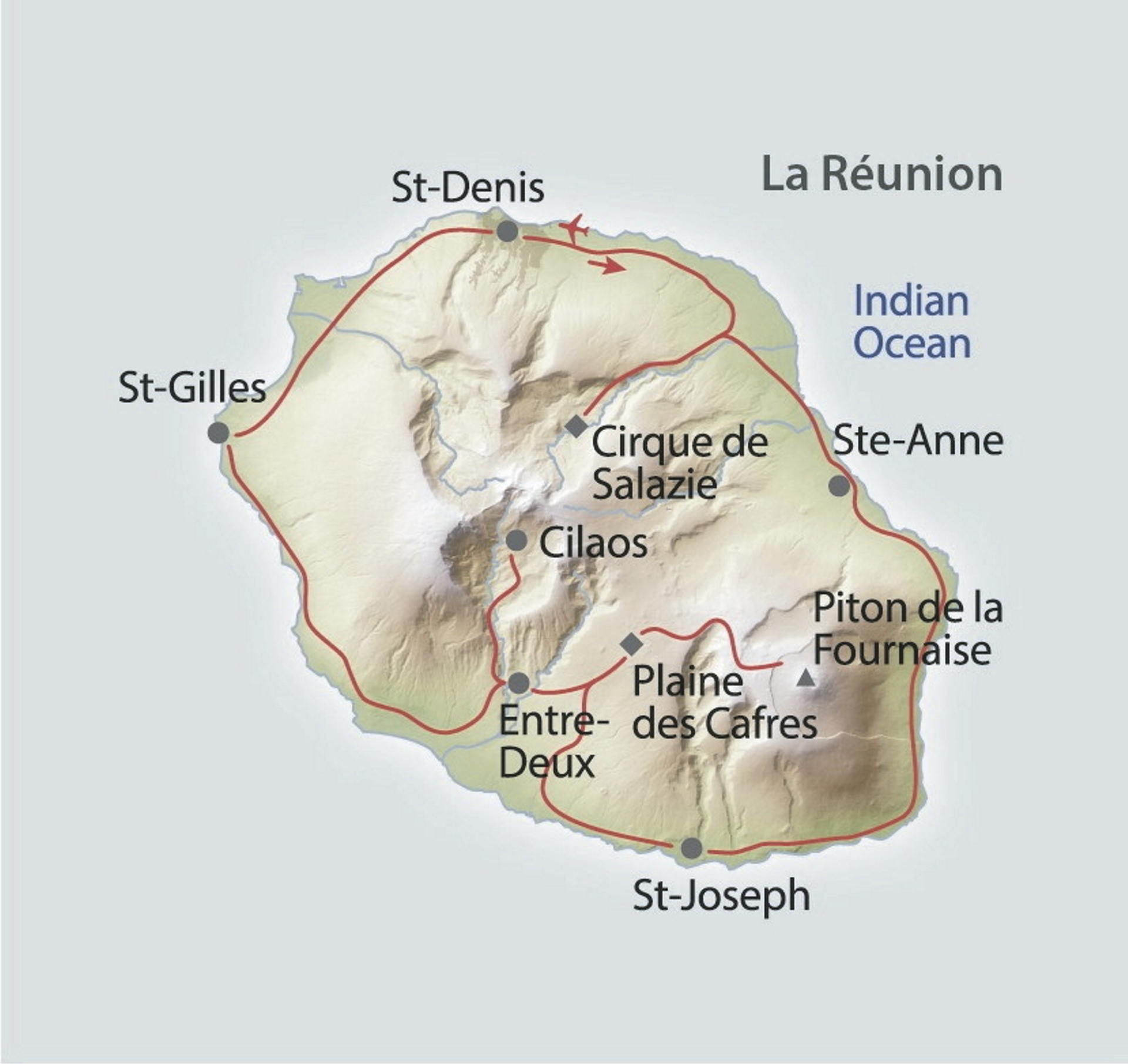La Réunion, die Insel mit tausend Gesichtern, wie die Einheimischen sagen, ist eine Insel der Kontraste. Tropische Vegetation und faszinierende Berg- und Canyonlandschaften, aktiver Vulkanismus und ein buntes Völkergemisch bestimmen das Bild. Entdecken Sie La Réunion mit dem Mietwagen und zu Fuß auf herrlichen Wanderungen. Am kleinen, schönen Sandstrand von St-Gilles können Sie am Ende der Reise noch einen Badeaufenthalt verbringen.