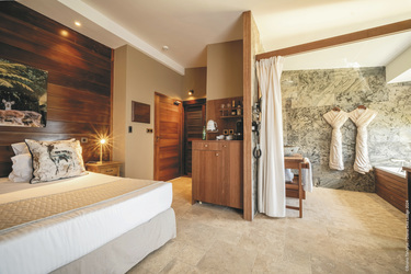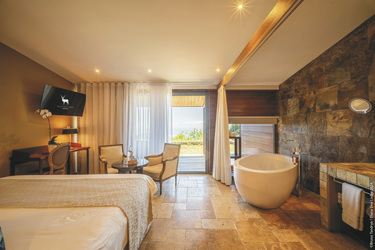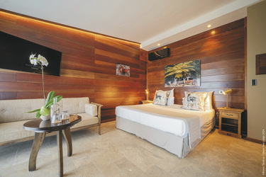 Die 30 Zimmer sind geschmackvoll, unter Verwendung von Holz und Vulkangestein, ausgestattet. Alle verfügen über Bad, Klimaanlage, Fön, TV, Minibar, Safe und Terrasse oder Balkon. Superior-Zimmer mit Meerblick. Die Privilege-Zimmer sind bei gleicher Ausstattung geräumiger und verfügen über einen tollen Panoramablick und Terrasse mit Sitzecke, Liegestühlen und kleinem Karpfenteich. Einen ganz besonderen Aufenthalt bieten die 5 Glamping-Zelte, ausgestattet mit Schlaf-, und Wohnbereich, Bad mit Dusche, Ankleidebereich, Minibar und überdachter Terrasse mit Jacuzzi. Die Lage etwas abseits der Lodge gewährleistet ein völliges Abtauchen in die Natur.