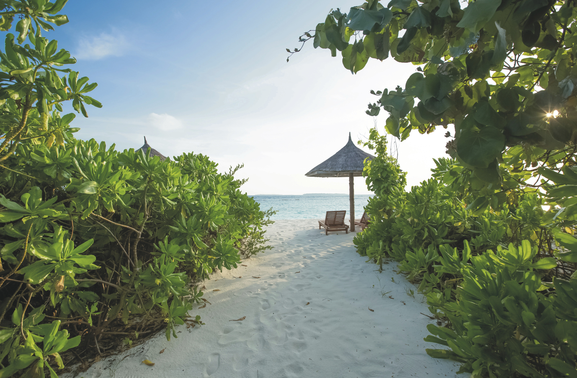 Reethi Faru - ein atemberaubendes tropisches Inselparadies mit weißen Sandstränden, türkisfarbenen Lagunen und nachhaltigem Luxus inmitten des unendlichen Blau des Ozeans.