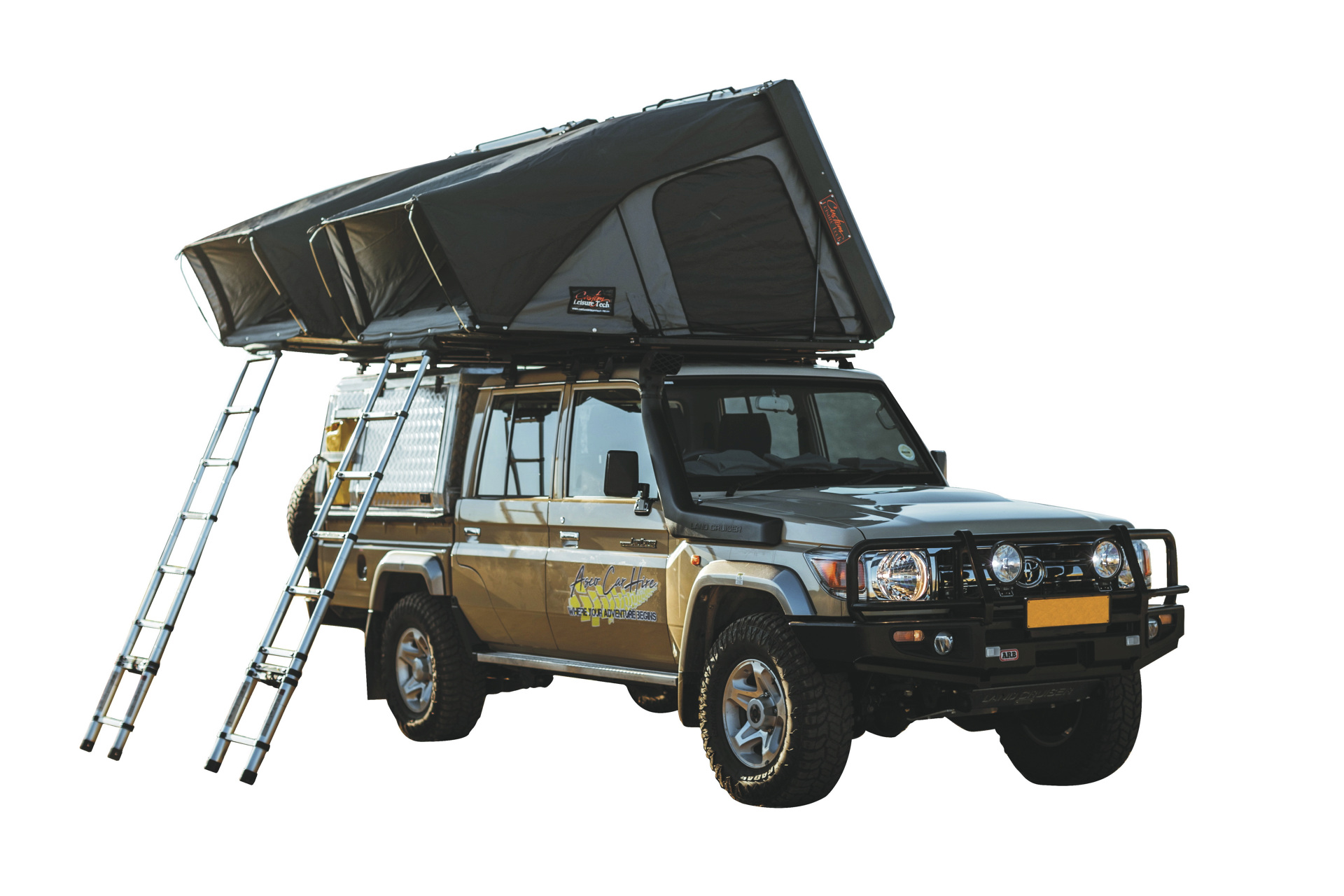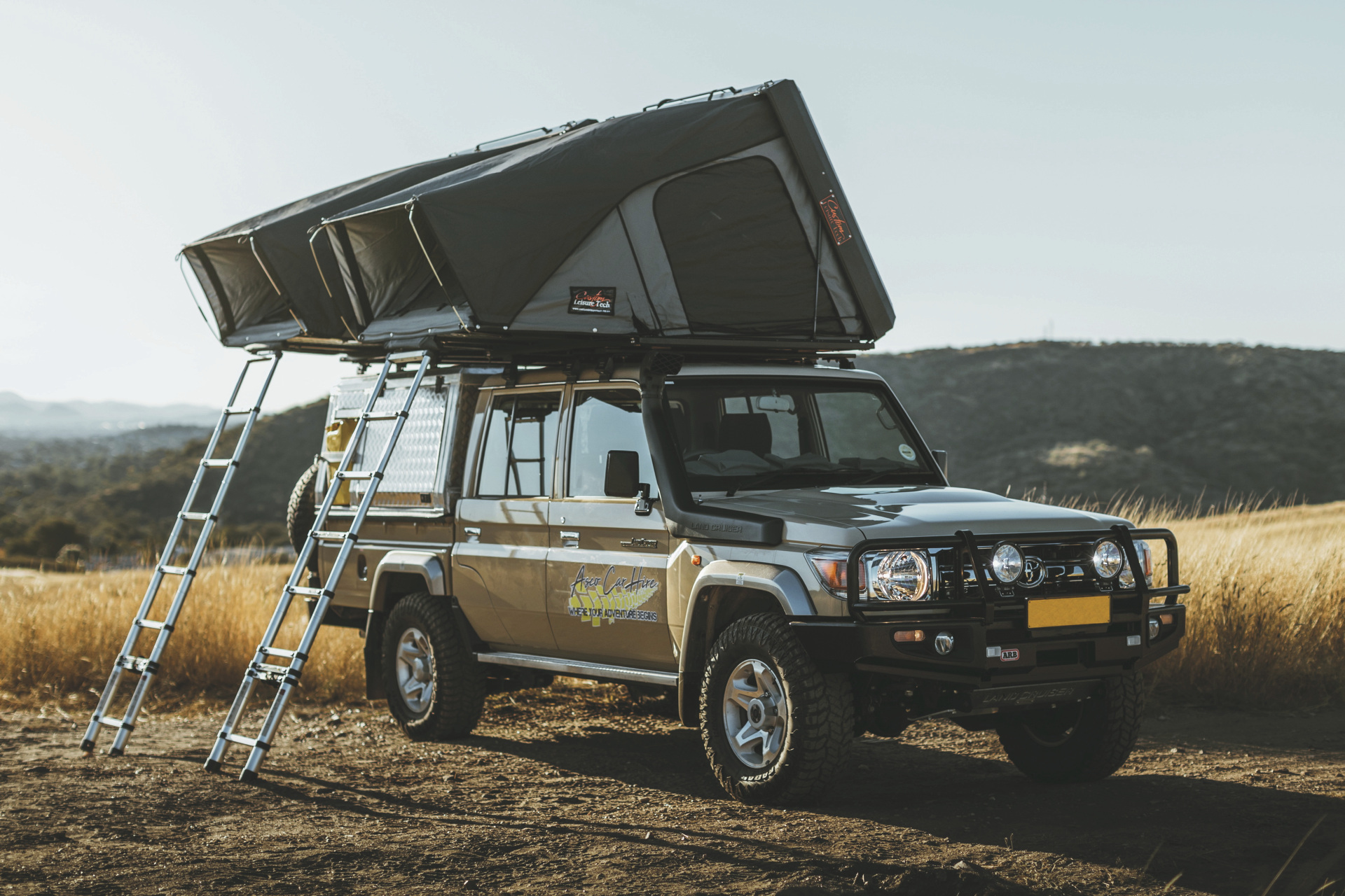 Der besonders zuverlässige Toyota Landcruiser verfügt über zwei große Hartschalen-Dachzelte sowie einen 200 l Treibstofftank für große Reichweite. Ein robuster 4x4-Camper für 3-4 Personen.