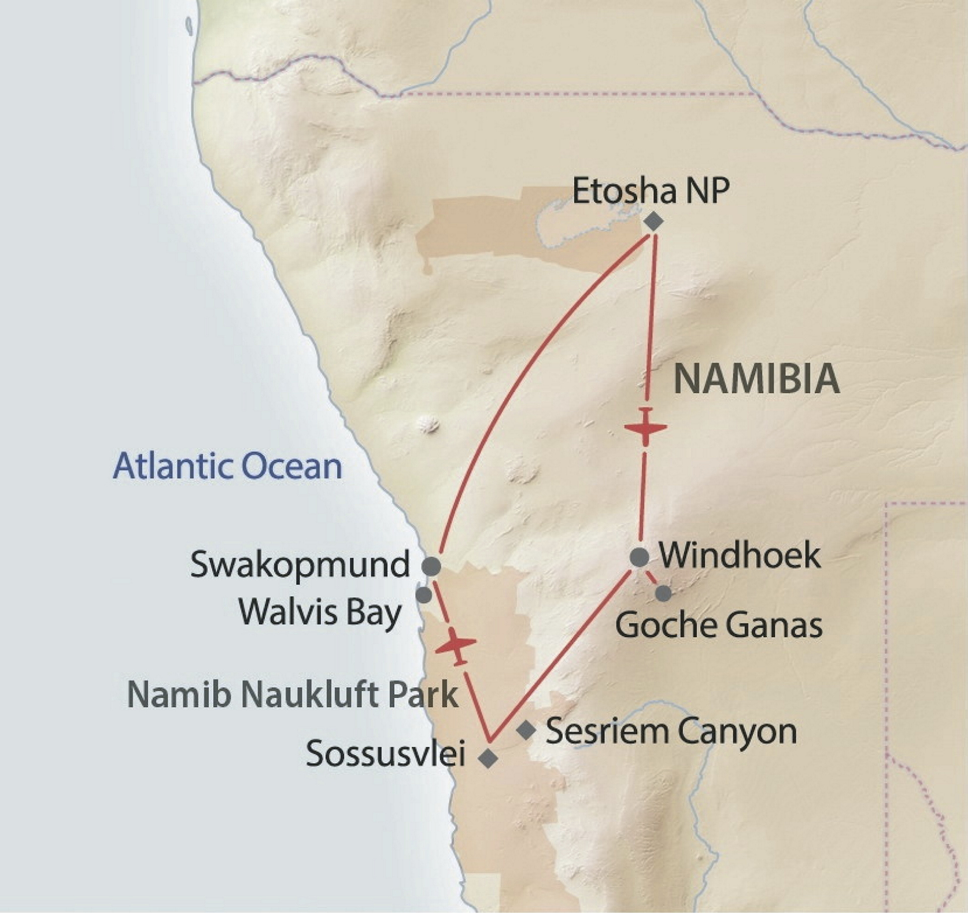 Sie haben ein begrenztes Zeitfenster für Ihren Namibia-Urlaub? Und keine Lust in kürzester Zeit weite Strecken auf den namibischen Straßen zurückzulegen, Sie möchten dennoch die bekannten Sehenswürdigkeiten entdecken? Wir haben Ihnen ein optimales Reiseprogramm zusammengestellt. In 12 Tagen sehen Sie Windhoek, gehen auf Pirsch im bekannten Etosha Nationalpark, haben in Swakopmund die Möglichkeit die umliegenden Sehenswürdigkeiten und Aktivitäten zu erleben und erkunden die Namib Naukluft Wüste mit den roten Dünen und dem bekannten Sossusvlei von ihrer schönsten Seite. Sie wohnen in hochwertigen Unterkünften und haben ein ausführliches Ausflugsprogramm sowie alle benötigten Inlandsflüge und Transfers eingeschlossen.