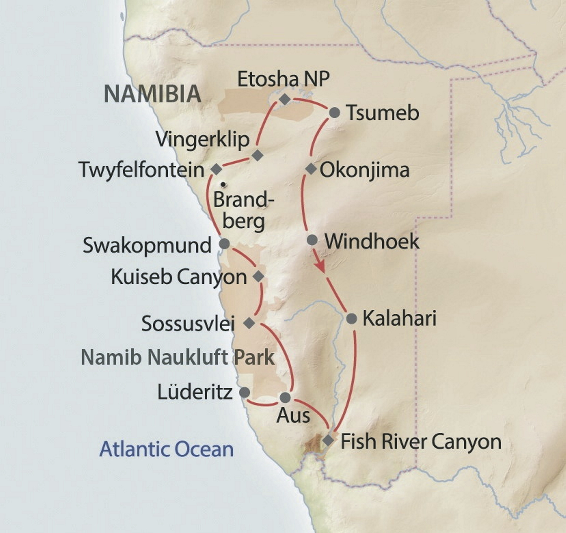 Unterwegs zum Etosha Nationalpark können Sie an optionalen Führungen durch den Versteinerten Wald teilnehmen. Hier liegen rund 260 Millionen Jahre alte, versteinerte Bäume oder besuchen Sie die Vingerklip, einen durch Wassererosion geformten Kalksteinkegel im Ugabtal. 2 Ü: Campingplatz Etosha Safari Camp.