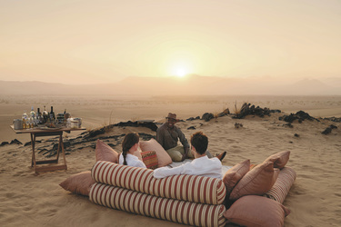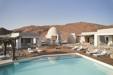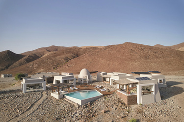 Die Luxusoase liegt im Herzen des menschenleeren Kaokolandes und bietet ein seltenes, ruhiges Erlebnis. Die dramatische Architektur in gebleichtem Weiß passt perfekt zu dieser epischen Landschaft. Im öffentlichen Bereich hat man weitestgehend auf Wände verzichtet. So hat man sowohl in der Bar, der Lounge und dem Speisezimmer ein einzigartiges Draußen-Gefühl, eine angenehme Brise kühlt die Räume und natürlich einen ungestörten Blick in die fantastische Landschaft. Genießen Sie köstliche Speisen und Getränke an außergewöhnlichen Orten: Brunch in der Wüste, Sundowner in den Dünen oder Picknick im Hoarusib Tal. Am Pool finden sowohl Sonnenhungrige als auch Schattenliebhaber ein Plätzchen zum Entspannen. Gemütlich wird es am Abend, wenn tausende von Sternen den Himmel erhellen und in der Feuerstelle ein einladendes Feuer flackert. Eingeschlossene Aktivitäten: Wüstenpirschfahrt, Fußpirsch auf der Suche nach den Wüstenelefanten, Panoramafahrt, Besuch eines Himba Dorfes, E-Bike Touren.