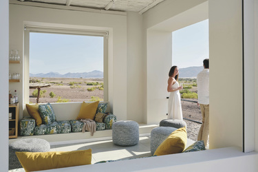 Die exklusive Lodge verfügt über 7 gut ausgestattete Suiten, von denen jede als Zufluchtsort vor der rauen Wüstenumgebung konzipiert ist und mit ruhigen Farben zur Entspannung einlädt. Große Panoramafenster erlauben viel Licht und geben den Blick in die Wüste frei. Jede Suite verfügt über ein modernes, helles Badezimmer mit Innen- und Außendusche, sowie Klimaanlage, Ventilator und eine private Terrasse mit einem schattigen Tagesbett. Für Familien gibt es eine Villa mit 2 Schlaf- und Badezimmern, eigenem Barbereich und einer Boma.