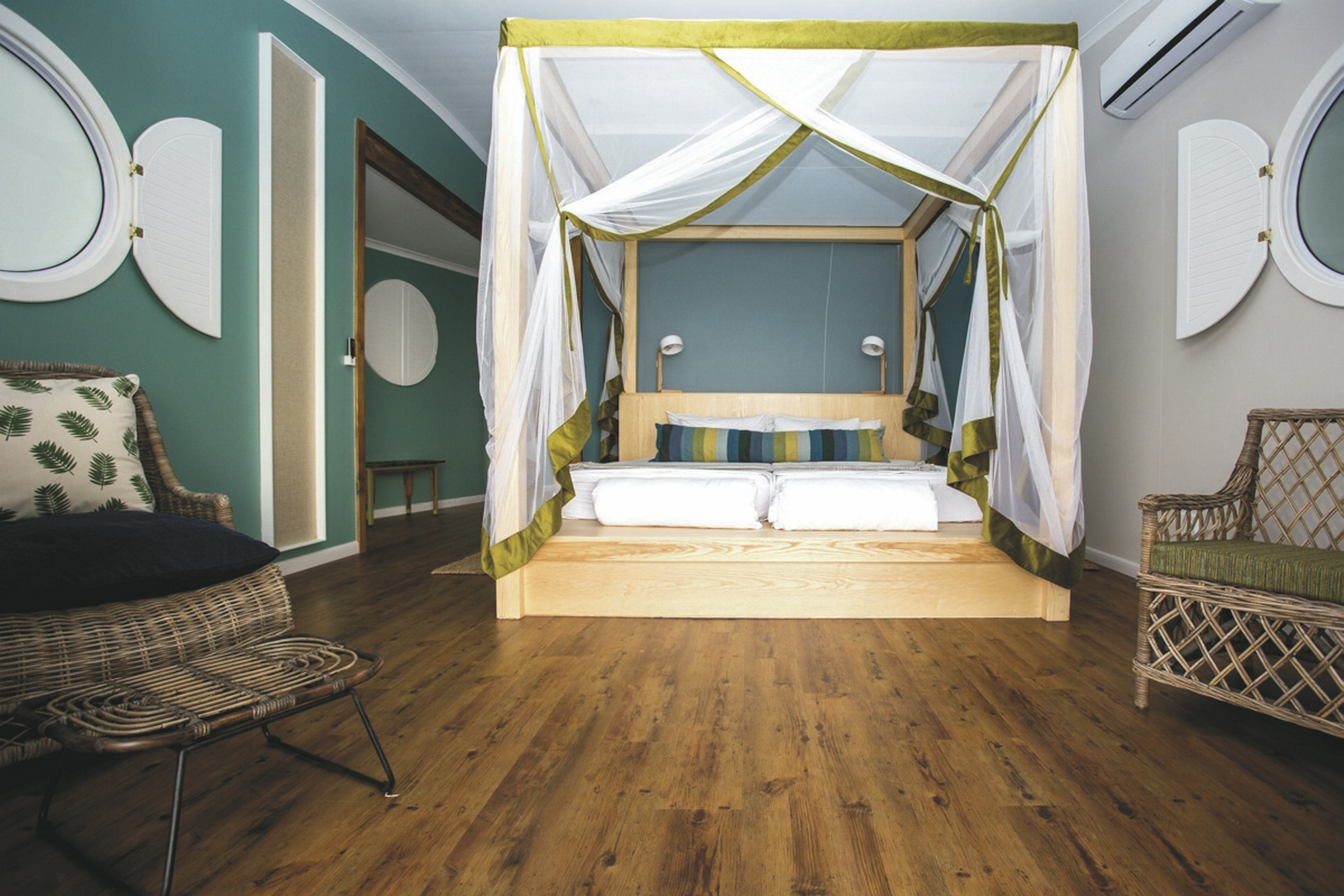 Die 21 modernen Bungalows wirken von außen ein wenig futuristisch. Von innen eher wie eine Schiffskabine mit den seitlichen Bullaugen ähnlichen Fenstern. Eine große Fensterfront führt auf die Terrasse, die - wie sollte es hier anders sein - auf den Fluss hinausführt, sogar vom Bett können Sie beim Aufwachen das Treiben am Fluss beobachten. Alle Bungalows verfügen außerdem über ein modernes Bad, Klimaanlage/Heizung, Safe, Moskitonetz, Fön, Tee-/Kaffeezubereiter und einen Kühlschrank. 4 Bungalows mit 2 Schlafzimmern und einem gemeinsamen Bad sind für Familien mit max. 4 Personen geeignet.