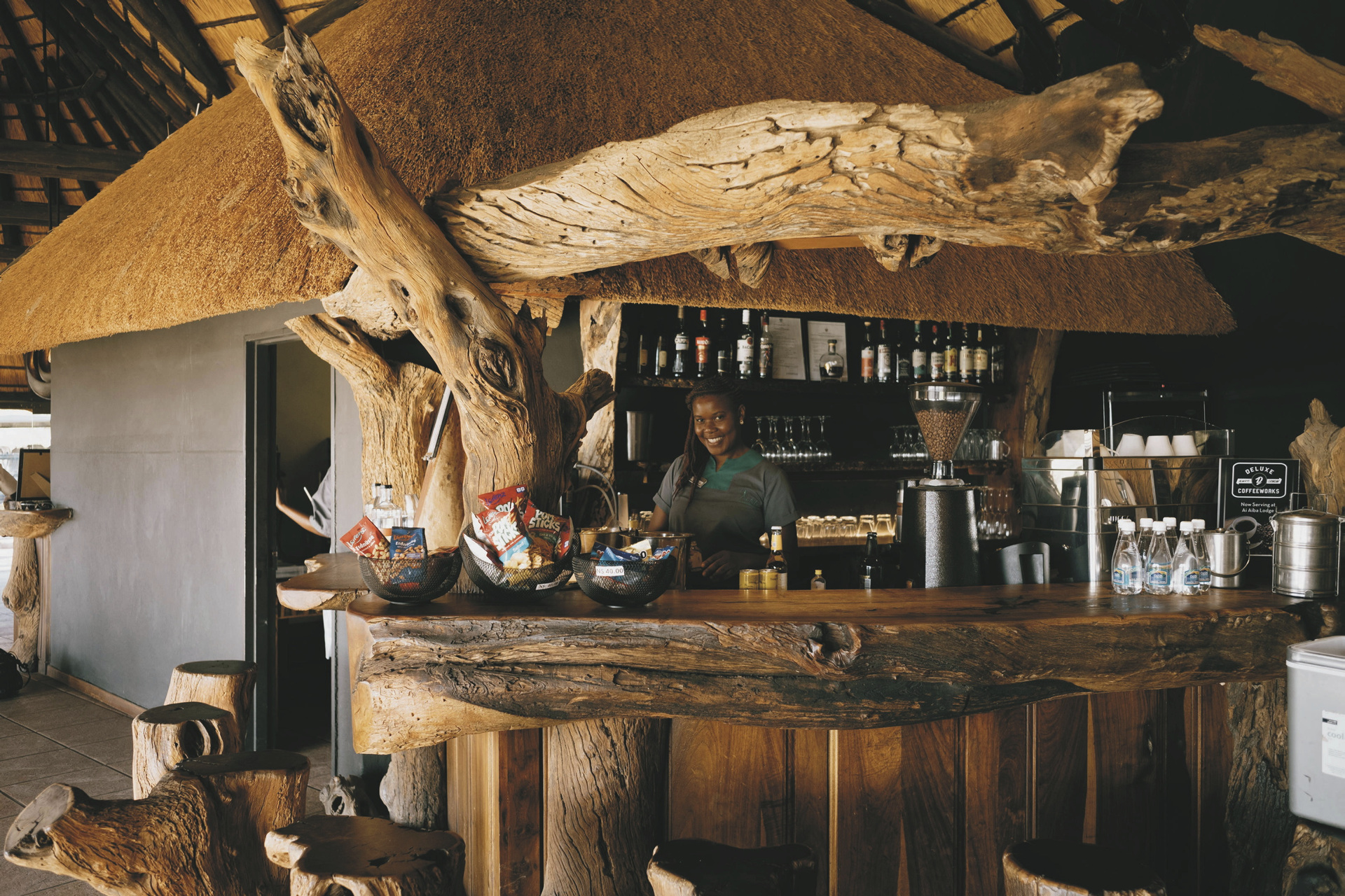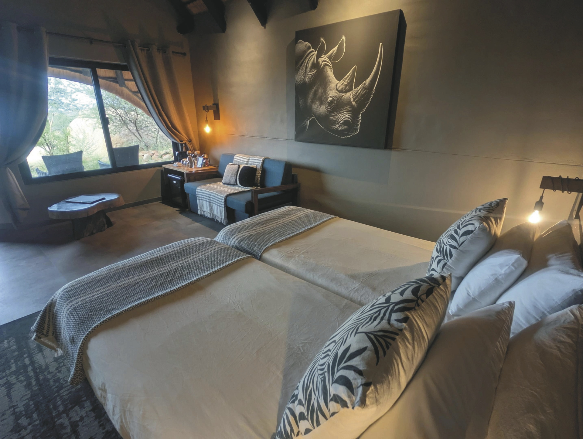 Die Lodge überblickt die bezaubernd schöne Landschaft des Erongo Gebirges und liegt in der näheren Umgebung vieler prähistorische Felsmalereien, die Sie erahnen lassen, wie das Leben der San vor vielen Jahren gewesen sein muss. Vom Restaurant und der Bar genießen Sie einen überwältigenden Panoramablick. Der Pool lädt nach einem erlebnisreichen Tag zum Entspannen und Ausruhen ein. Am Abend sitzen Sie an der Feuerstelle und können, fernab jeglicher Zivilisation, das funkelnde Firmament bestaunen. Nehmen Sie sich vor dem Abendessen etwas Zeit und begeben Sie sich mit einem Lodgemitarbeiter auf einen der vielen umliegenden Granitfelsen und genießen Sie dort einen spektakulären Sonnenuntergang. Kostenloses WLAN finden Sie im Hauptgebäude. Optionale Aktivitäten: geführte Wanderungen, Mountainbike, oder E-Bike Touren; Panoramafahrten, auch zu den Felsmalereien, ein Besuch im lebendigen Museum der San, des Weiteren können Sie auf markierten Wegen die Umgebung zu Fuß alleine erkunden. Besichtigungen der Felskunst auch auf den benachbarten Farmen Etemba und Omandumba runden Ihre Erfahrungen mit der San Kultur ab.