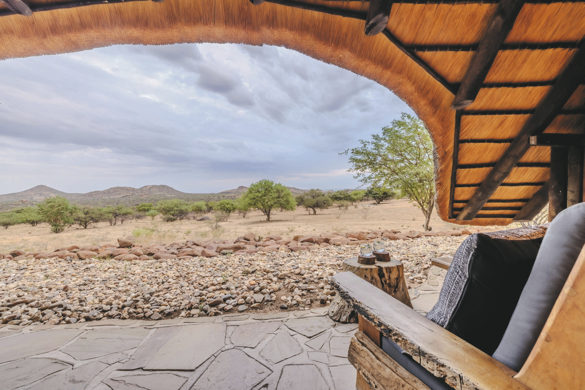 Am Fuße massiver Granitfelsen im Erongo Gebirge liegt die Lodge ca. 40 km vom Omaruru und 195 km von Swakopmund entfernt.