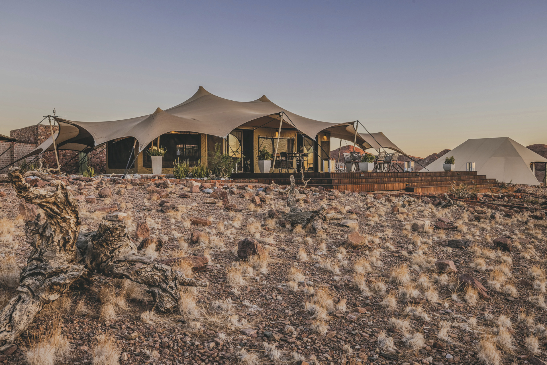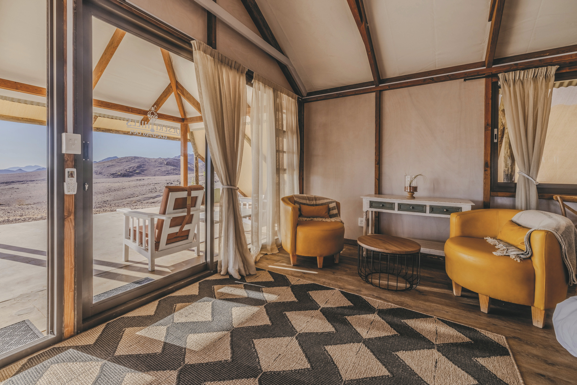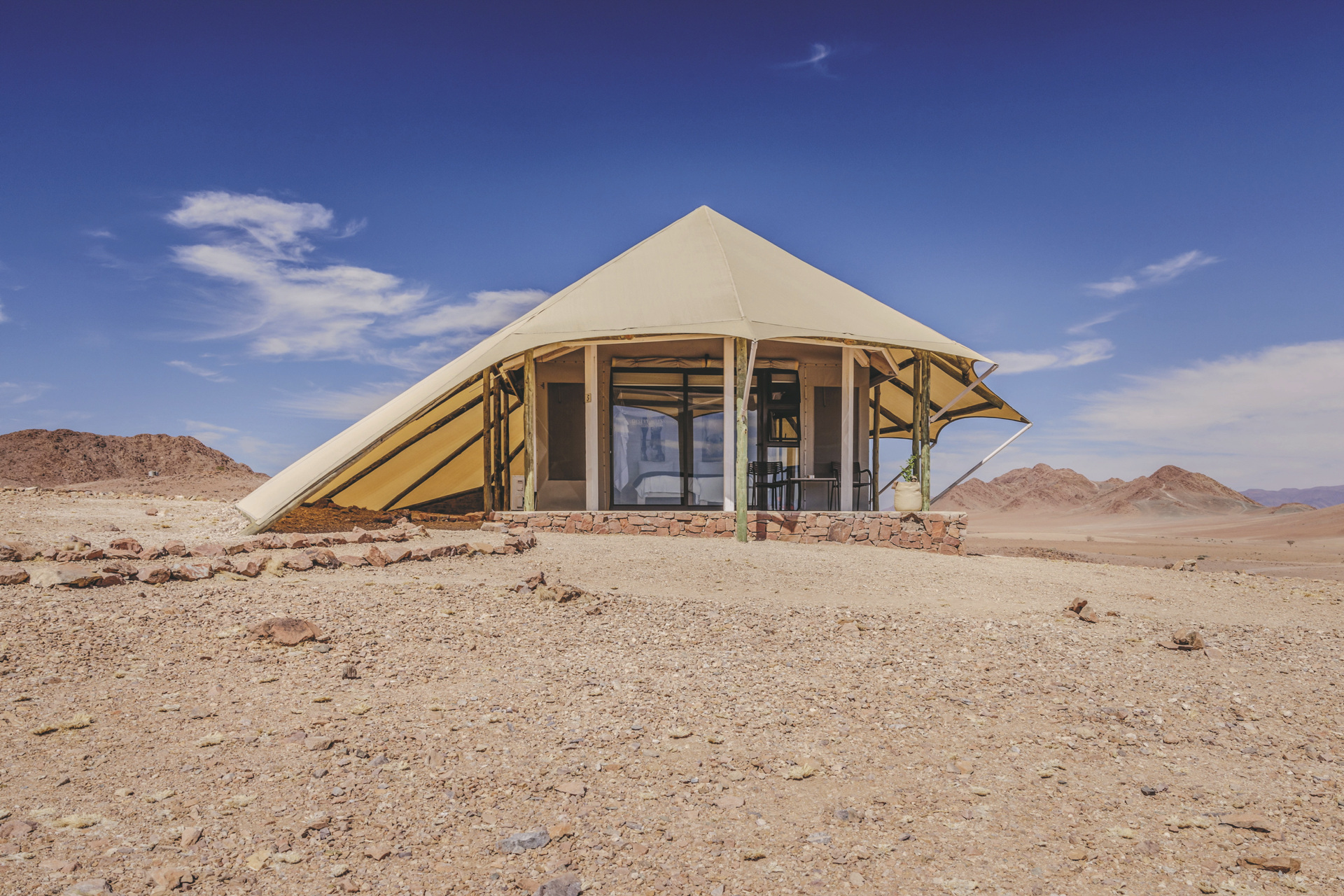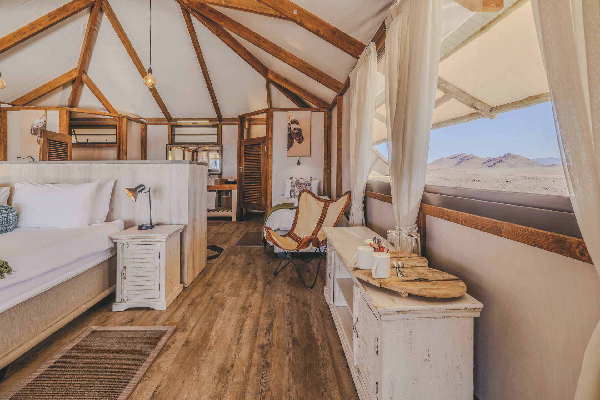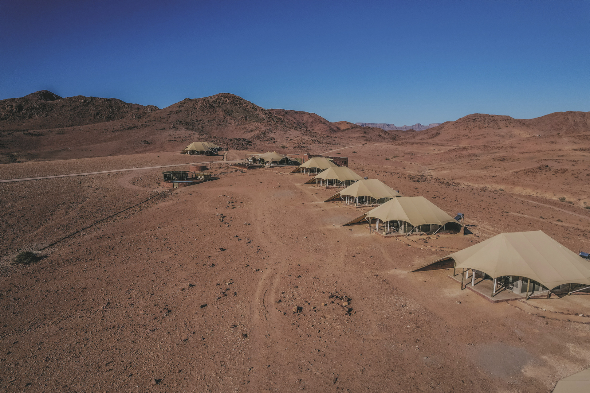 Die 10 großzügigen Safarizelte wurden mit hellem Holz und viel Liebe zum Detail eingerichtet. Jedes verfügt über ein geräumiges Bad; einen Loungebereich, Ventilator, Klimaanlage und eine überdachte Terrasse. Vom Bett hat man einen atemberaubenden Ausblick in die namibische Wüste. Es gibt ein Familienzelt mit zwei Schlafzimmern und einem gemeinsamen Badezimmer, sowie Zelte mit Zustellbetten.