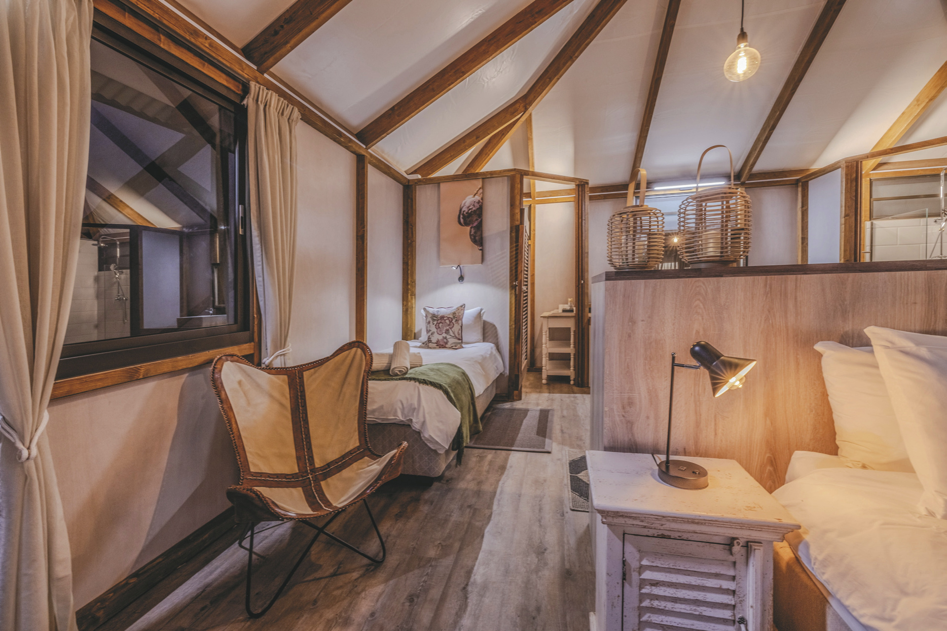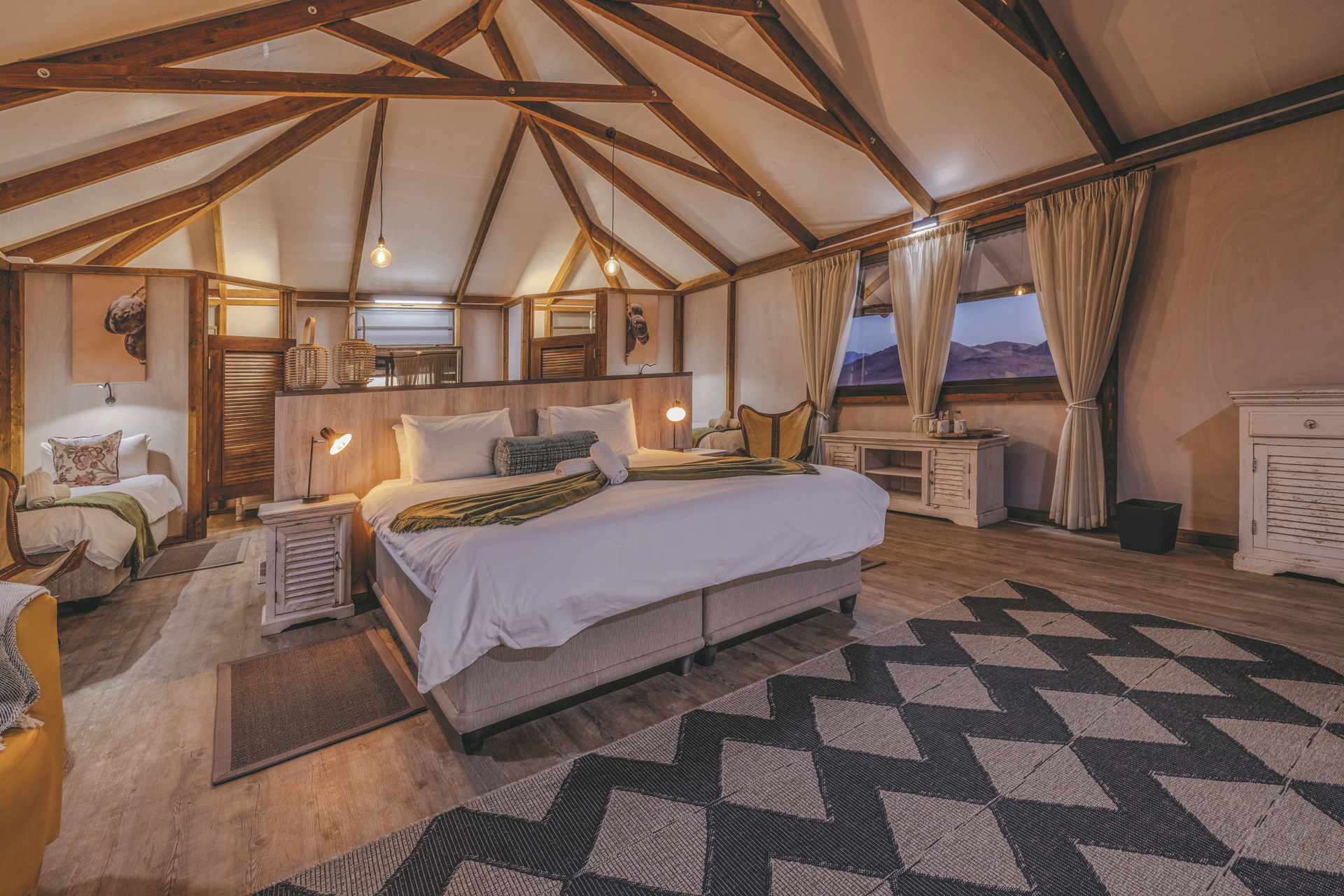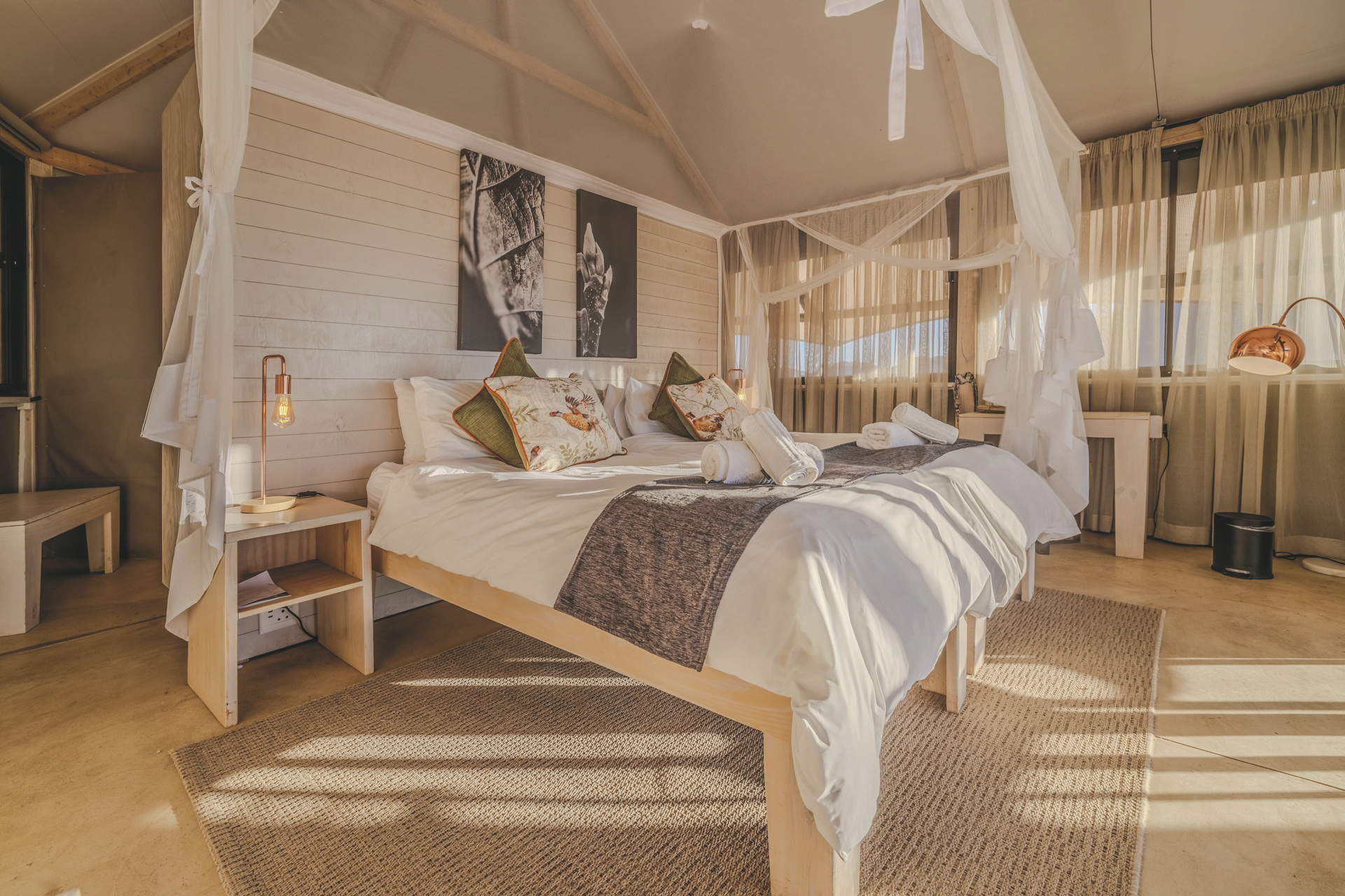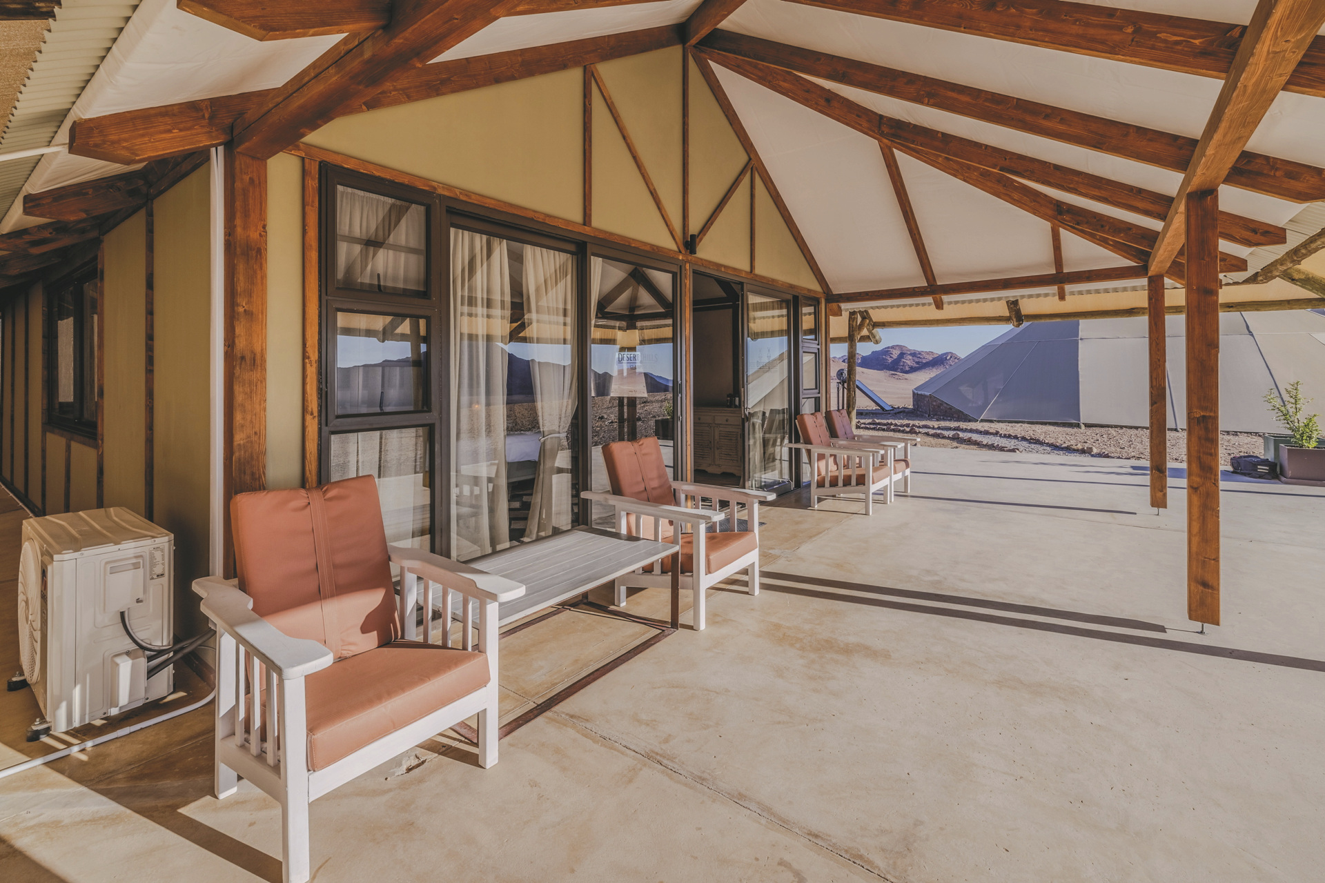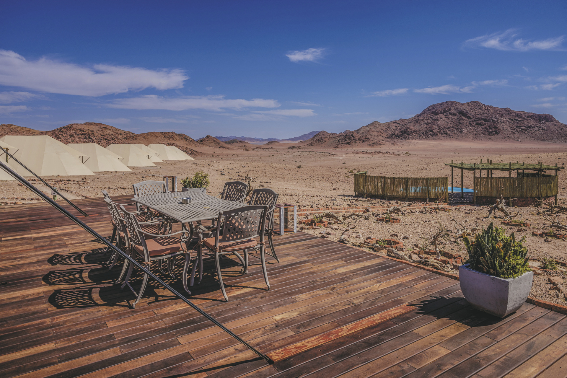 Die 10 großzügigen Safarizelte wurden mit hellem Holz und viel Liebe zum Detail eingerichtet. Jedes verfügt über ein geräumiges Bad; einen Loungebereich, Ventilator, Klimaanlage und eine überdachte Terrasse. Vom Bett hat man einen atemberaubenden Ausblick in die namibische Wüste. Es gibt ein Familienzelt mit zwei Schlafzimmern und einem gemeinsamen Badezimmer, sowie Zelte mit Zustellbetten.