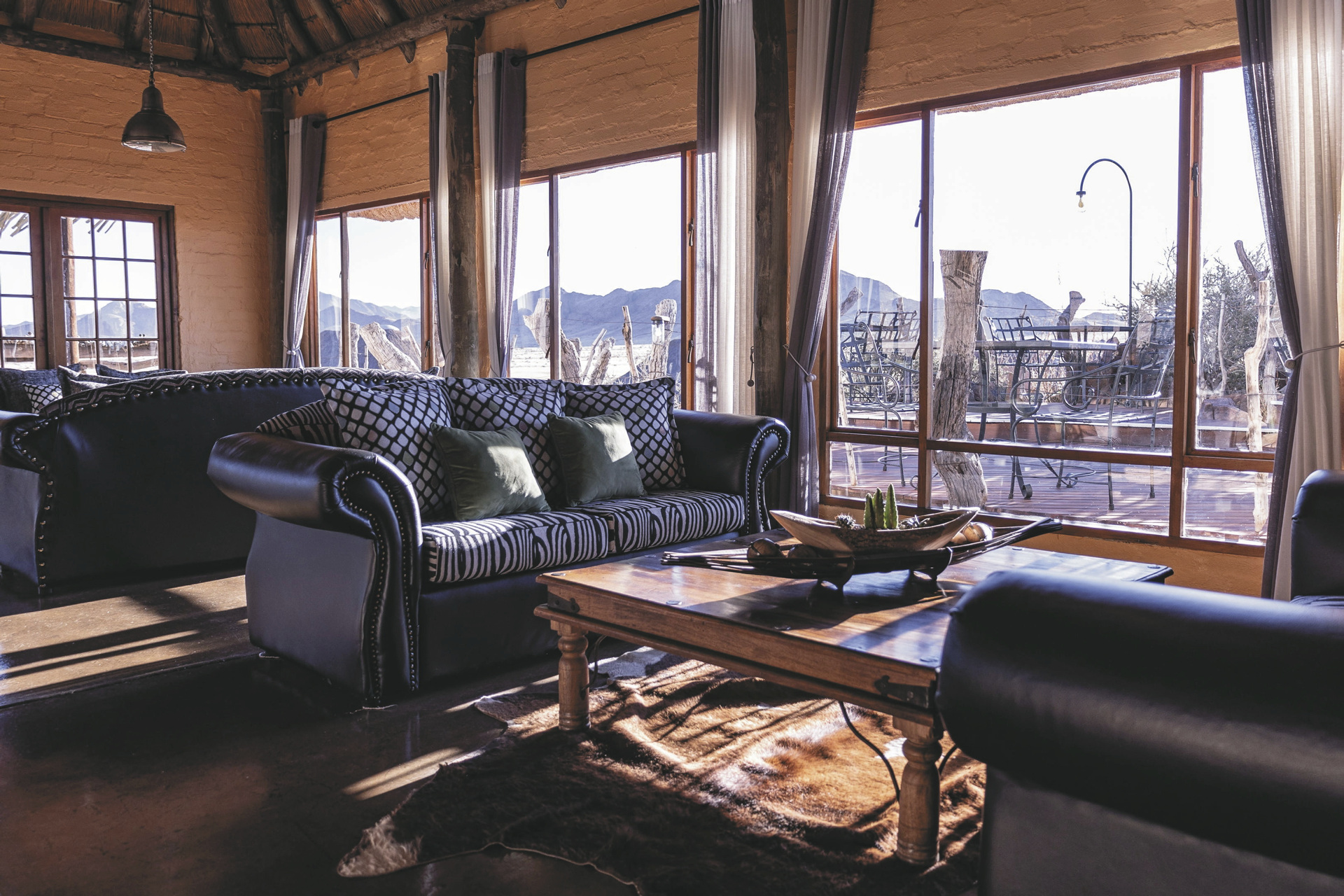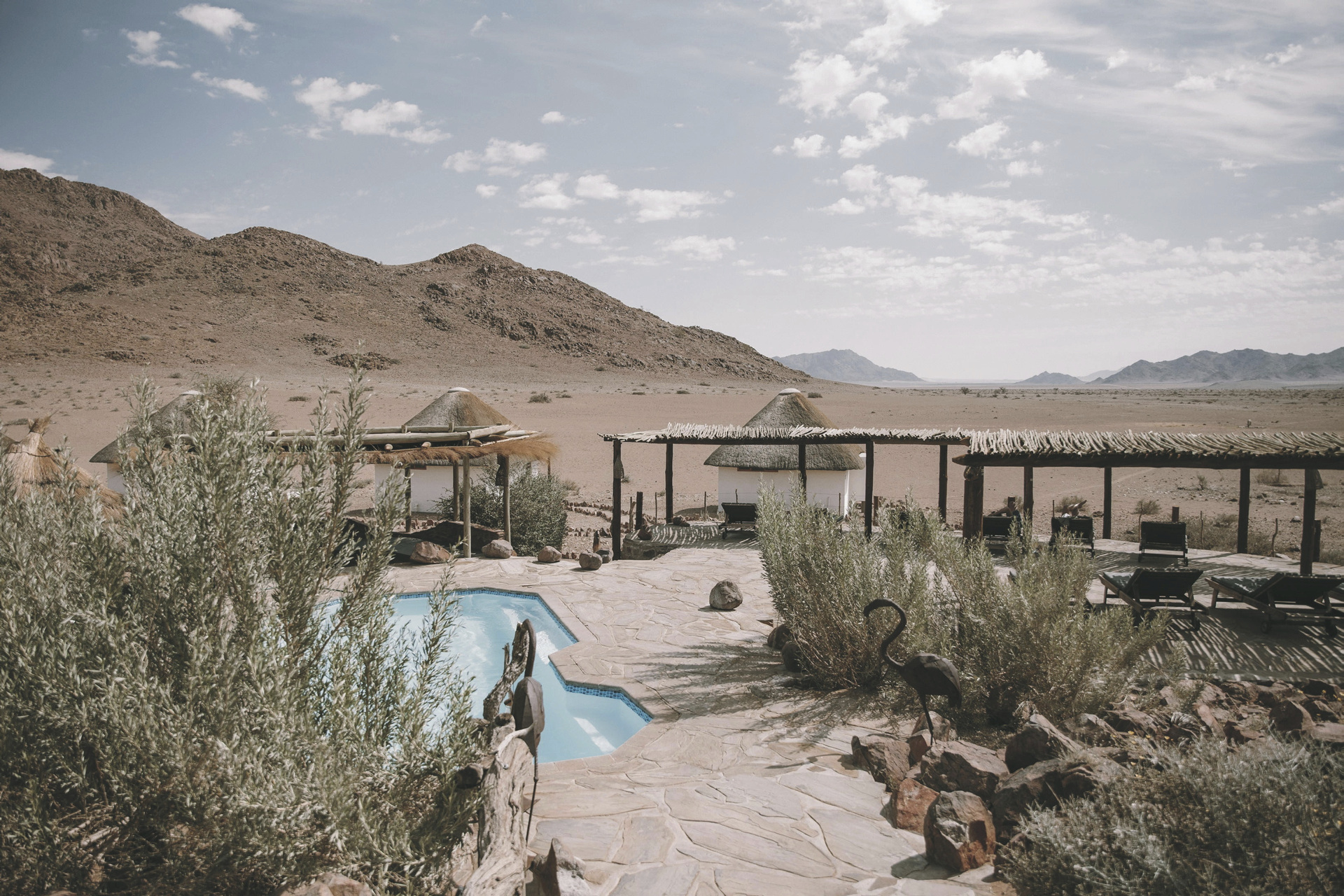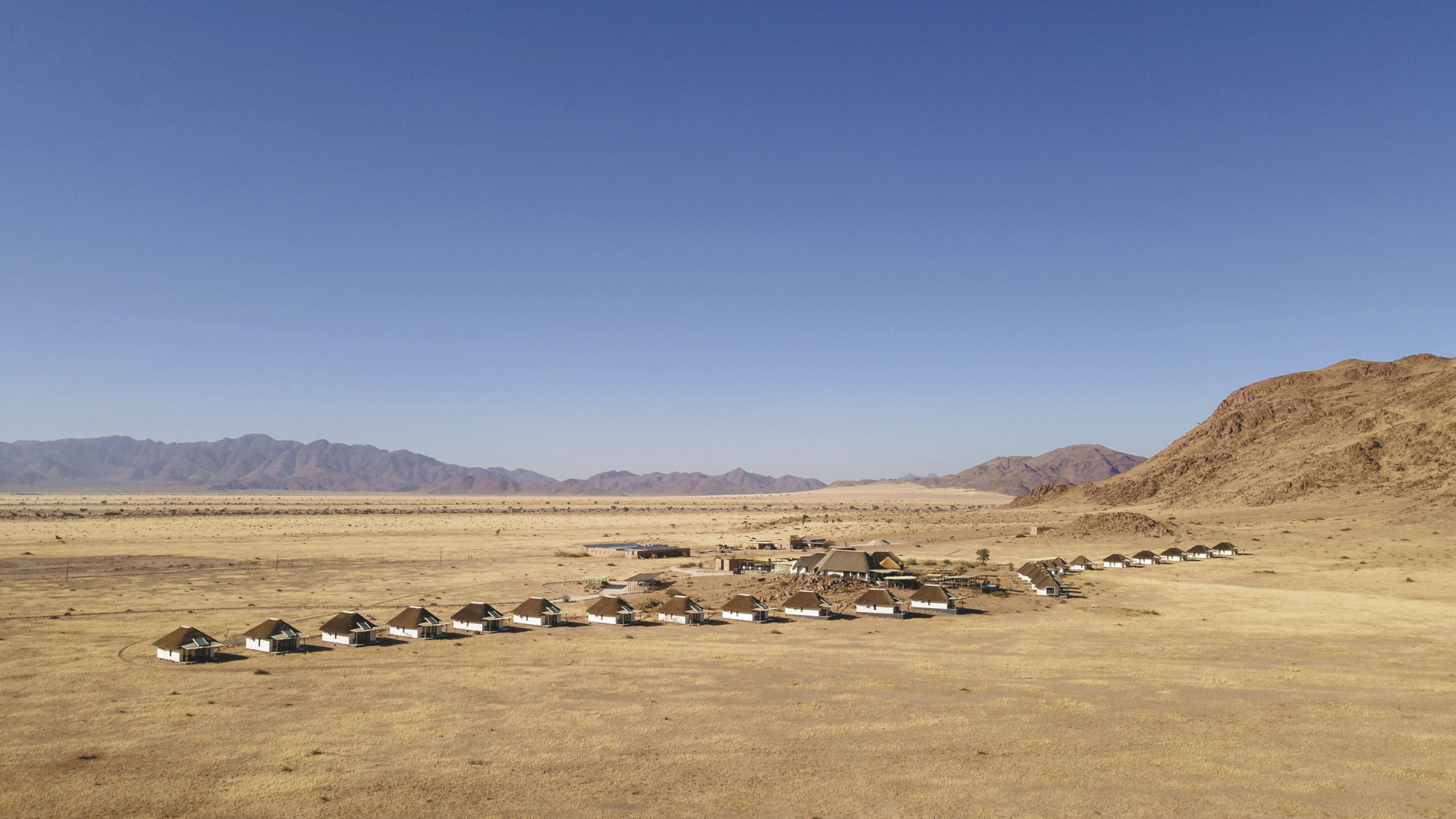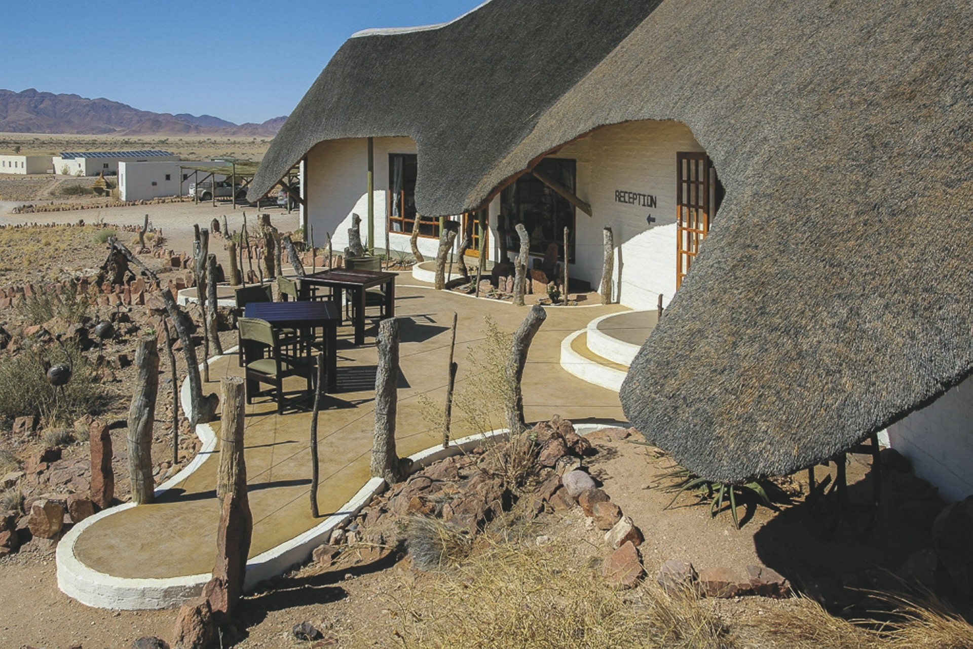 Die Lodge ist im Stil eines modernen, riedgedeckten Gutshofes mit Pferdegestüt angelegt, es wird großen Wert auf Nachhaltigkeit gelegt. Das Haupthaus steht auf einem Hügel und bietet einen herrlichen Panoramablick. Hier befinden sich das Restaurant mit Terrasse, die Bar, Lounge, Shop und zwei Pools mit großer Sonnenterrasse. Kostenloses WLAN im Hauptbereich. Optionale Aktivitäten: Ausflug zum Sossusvlei, Reitsafari für Anfänger und Könner, markierte Wanderwege, Panoramafahrten; Namib Night - zweitägige Reitsafari mit Übernachtungen im mobilen, rustikalen Zeltcamp.