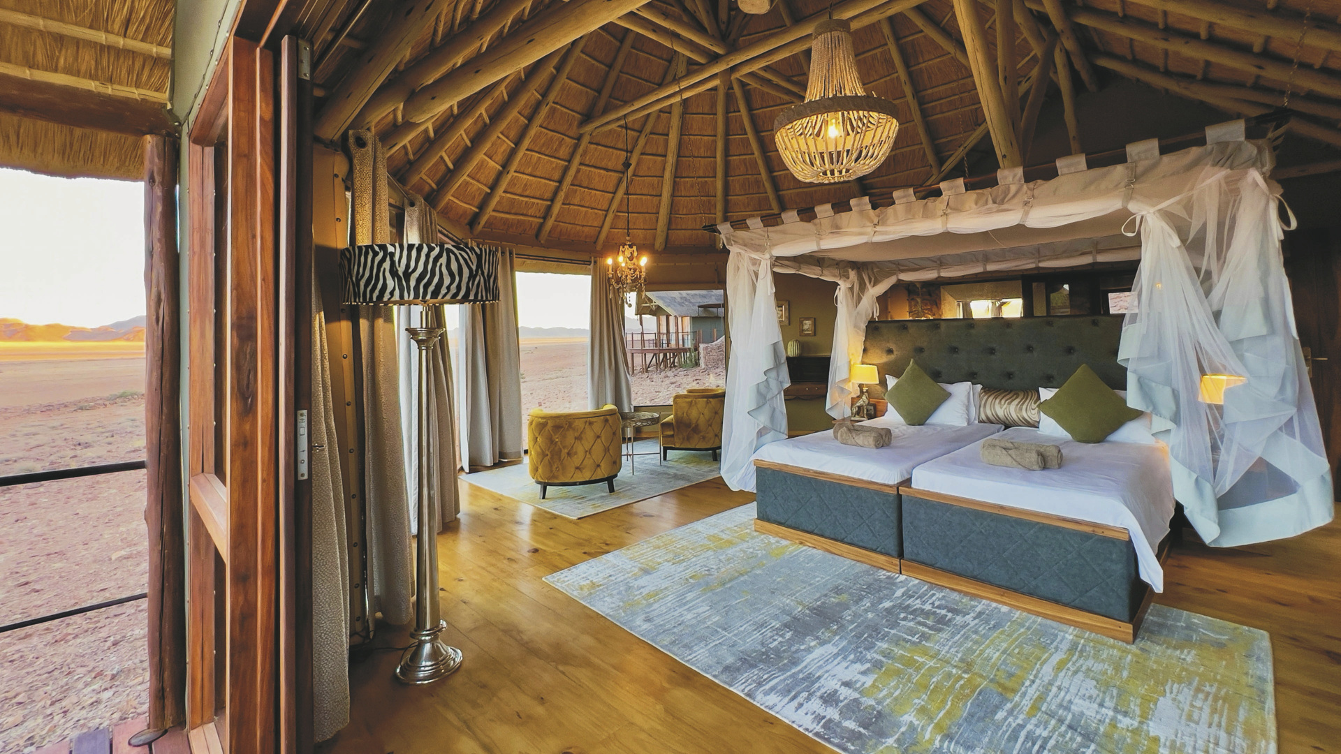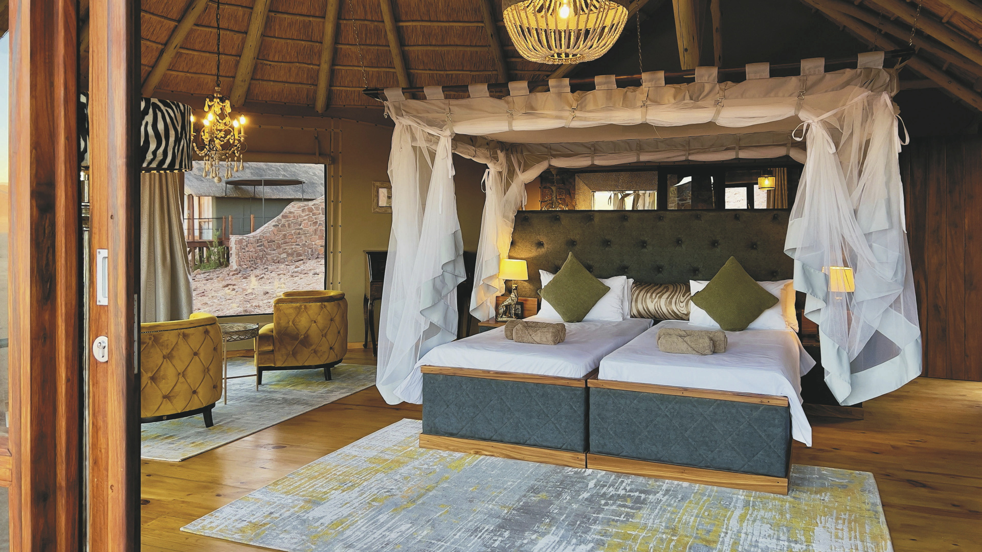 Es gibt 10 großzügige Suiten mit eigenem Bad und Außendusche sowie Moskitonetz, Kühlschrank, Tee-/Kaffeezubereiter, Minibar, Fön, Safe, Klimaanlage und einem bequemen Loungebereich. Von der großen, schattigen Terrasse können Sie das umherziehende Wild auf der Ebene beobachten. Hier können Sie auch die Nacht unter dem freien Himmel verbringen und dabei den einmaligen namibischen Sternenhimmel betrachten. Die Superior-Suite bietet viel Platz zum Wohlfühlen, sie ist fast doppelt so groß und punktet außerdem mit einem eigenen Plunge Pool. Im Familienhaus sind die kleinsten Gäste mit ihren Eltern wunderbar in zwei Schlafzimmern untergebracht.
