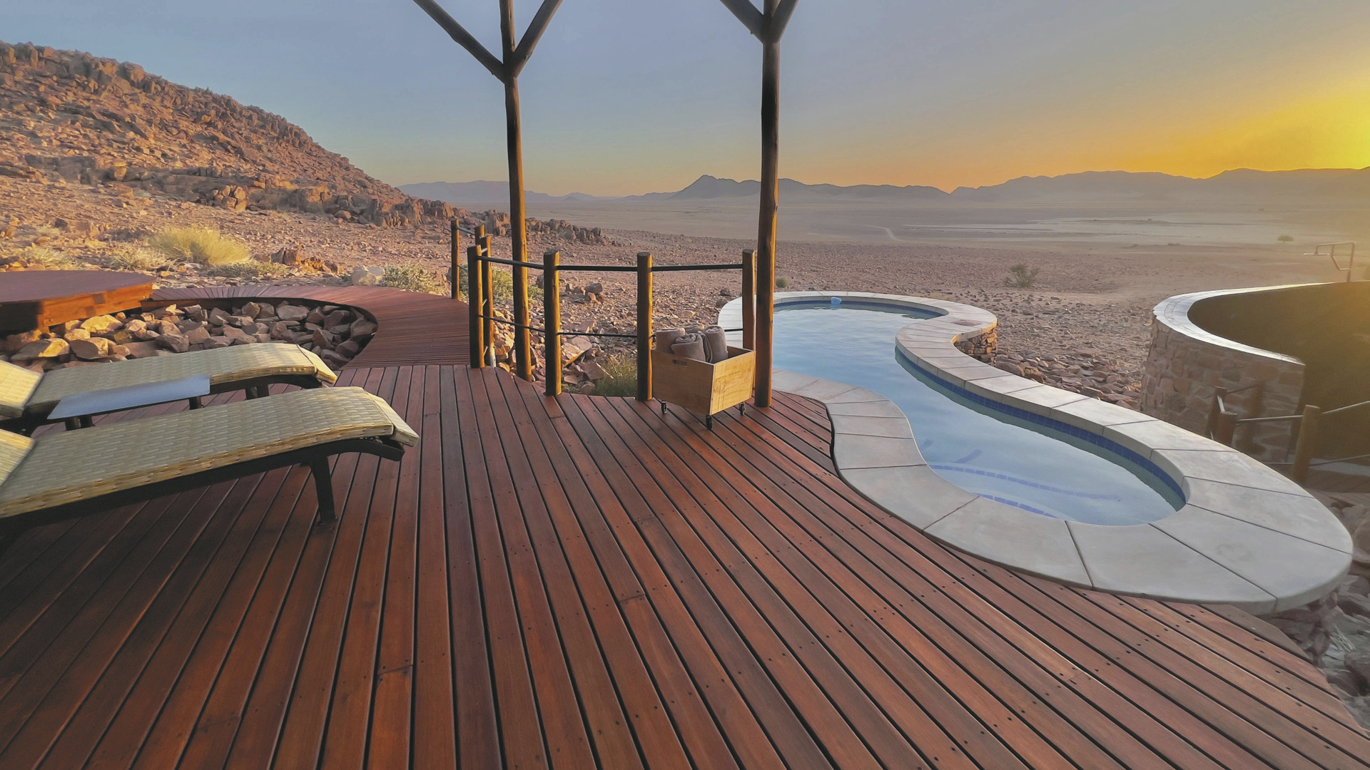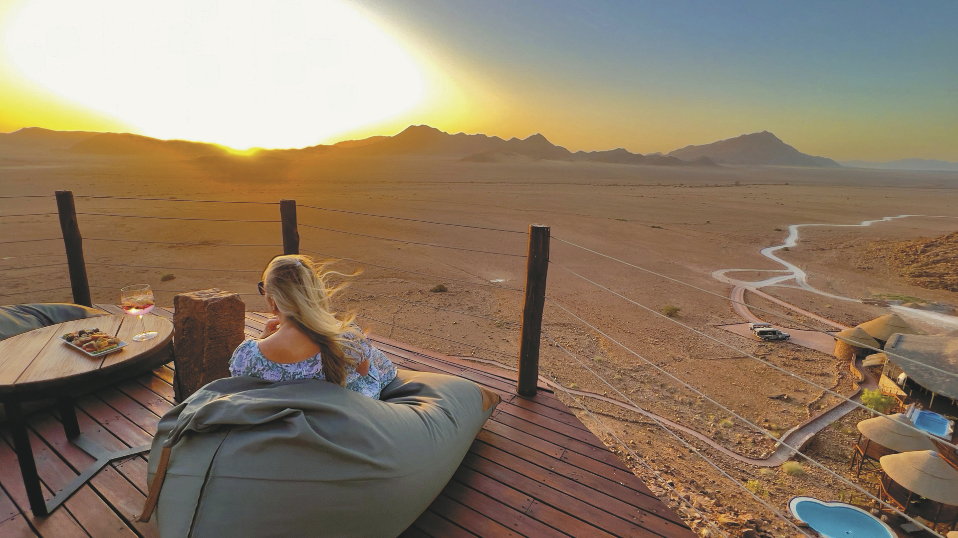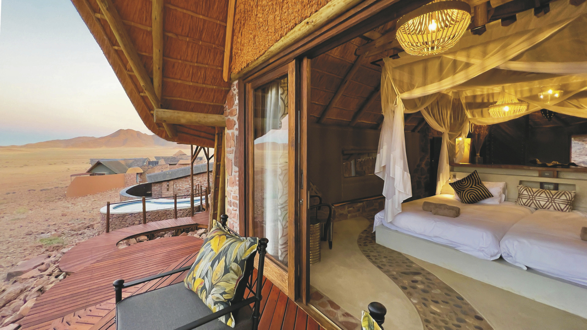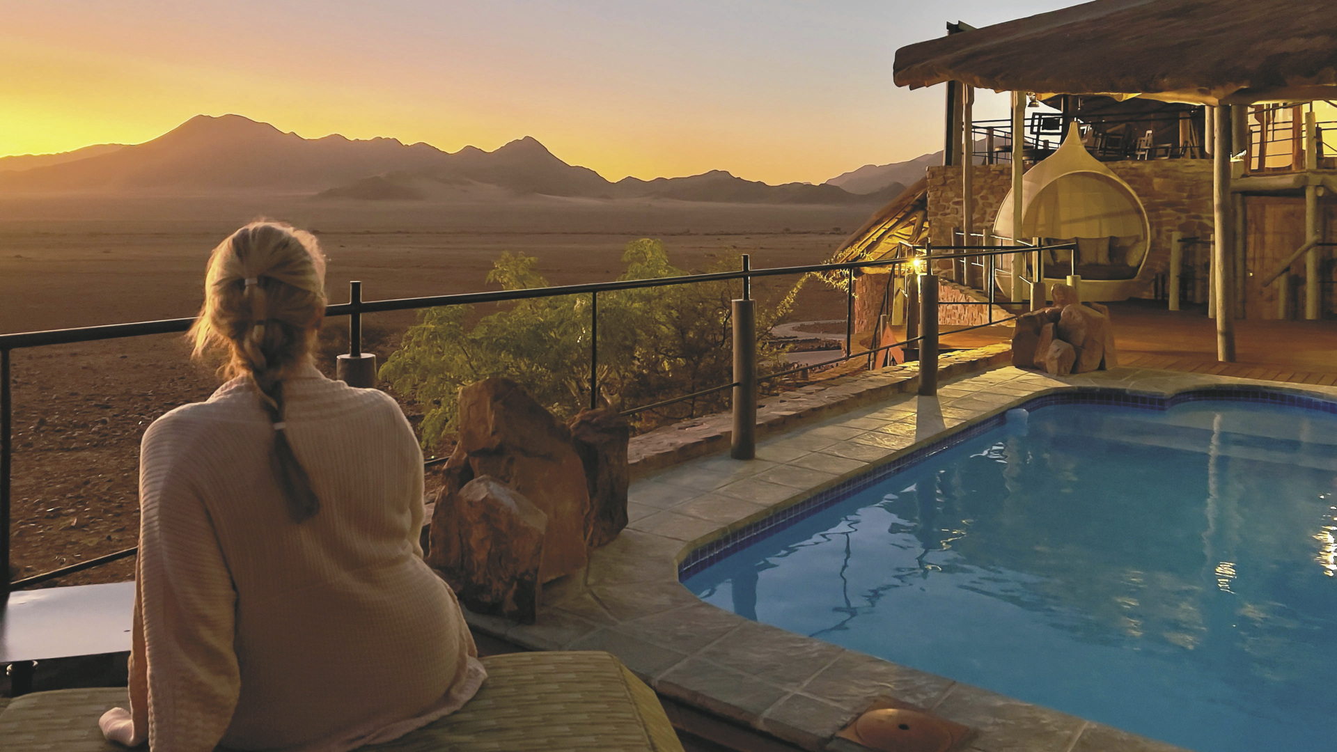 Im Haupthaus befinden sich das Restaurant sowie die Bar mit großer Terrasse. Für Abkühlung nach einem langen Tag in den Dünen stehen Ihnen zwei Pools und eine schattige Sonnenterrasse zur Verfügung. Ebenfalls im Außenbereich finden Sie die Desert Lounge mit einer erlesenen Auswahl an Whiskey und Zigarren. Verwöhnen lassen können Sie sich im Spa. Ein bisschen oberhalb der Lodge hat man ein wunderbares Plätzchen gefunden, wo Sie auf der Aussichtsterrasse perfekt den Sonnenuntergang mit einem leckeren Getränk in der Hand zelebrieren können. Optionale Aktivitäten: Sossusvlei-Tour, Reitsafaris, markierte Wanderwege, Panoramafahrten und Fahrten zum Sonnenuntergang; etwas besonderes ist der zweitägige Reitausflug Namib Night mit einer Übernachtung im Dünencamp.