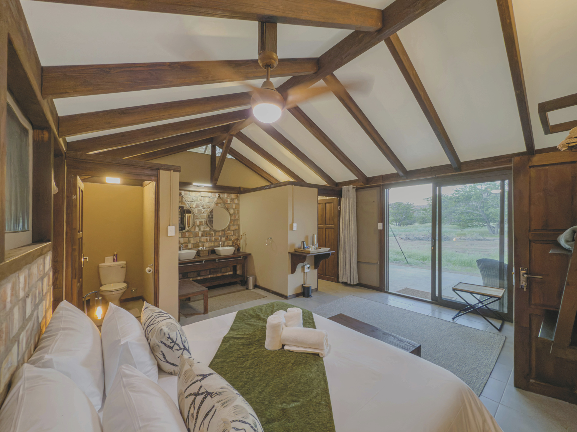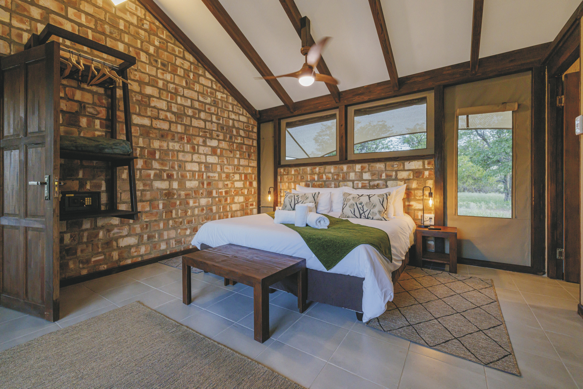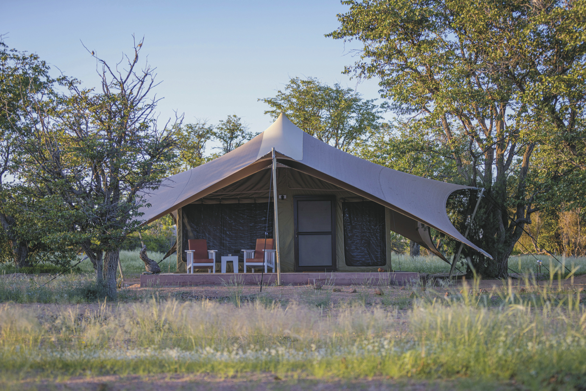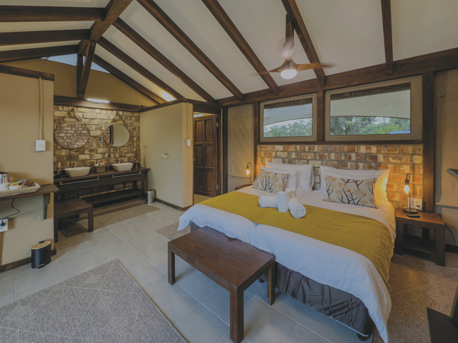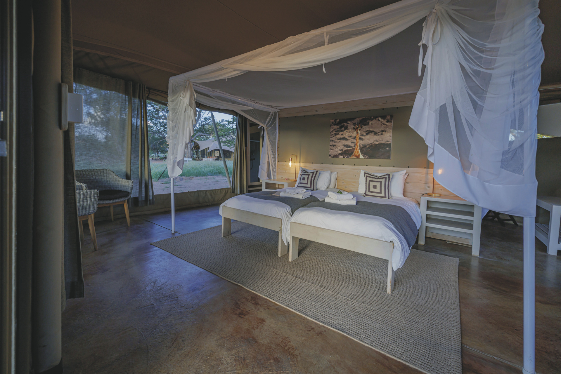 Die 9 geräumigen Safarizelte sind hell, mit viel Liebe zum Detail eingerichtet und verfügen alle über ein eigenes, offenes Badezimmer; Ventilator, Moskitonetz, Safe und eine kleine überdachte Terrasse. Durch die Moskitonetz bespannten Fenster hat man einen herrlichen Blick in den Busch, gleichzeitig sorgt dies für eine gute Belüftung und Klimatisierung. Genießen Sie das Abenteuer eines Zeltcamps, ohne auf Luxus zu verzichten! Zusätzlich gibt es für Familien ein geräumiges Safarizelt mit Schlaf- und einem Badezimmer.