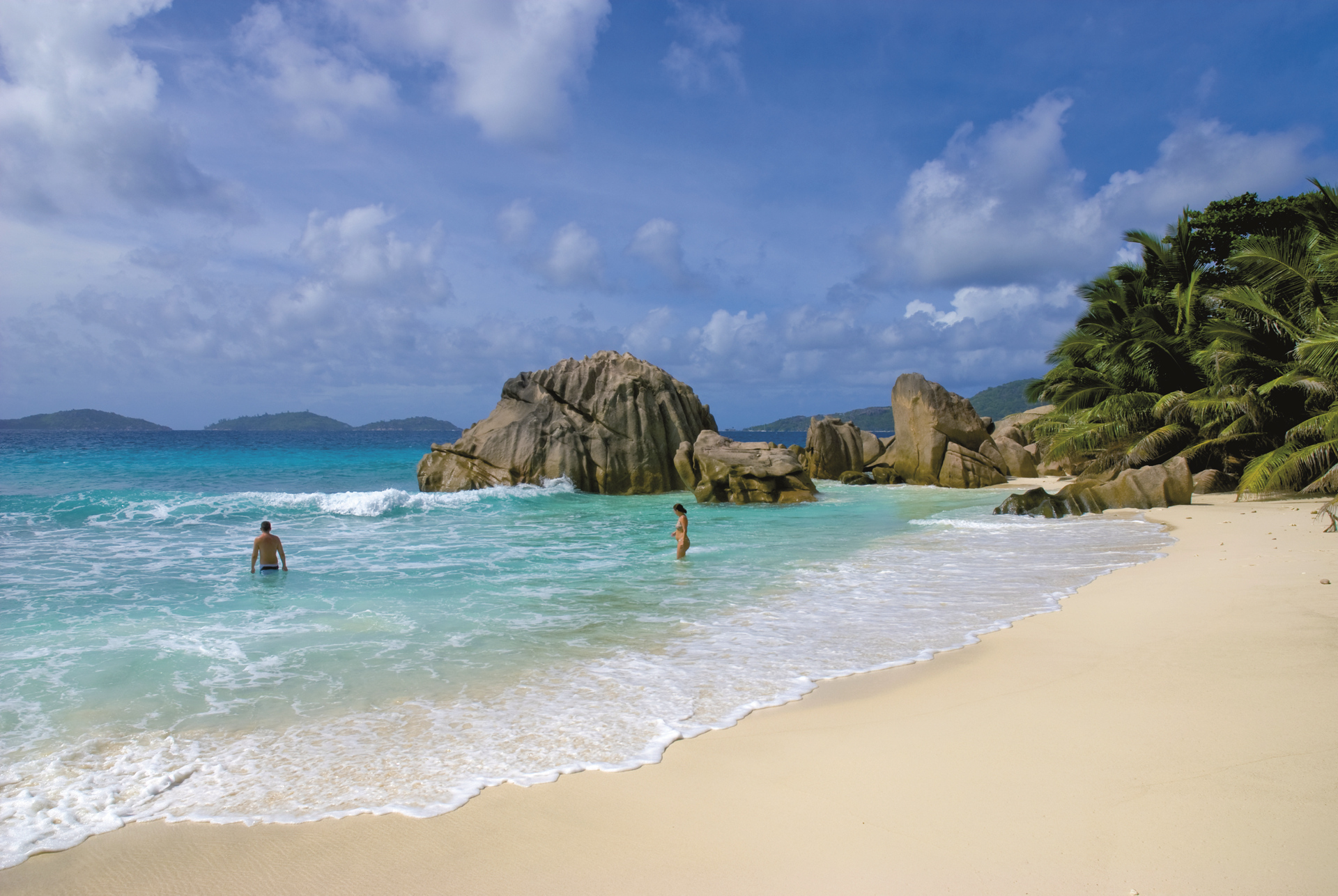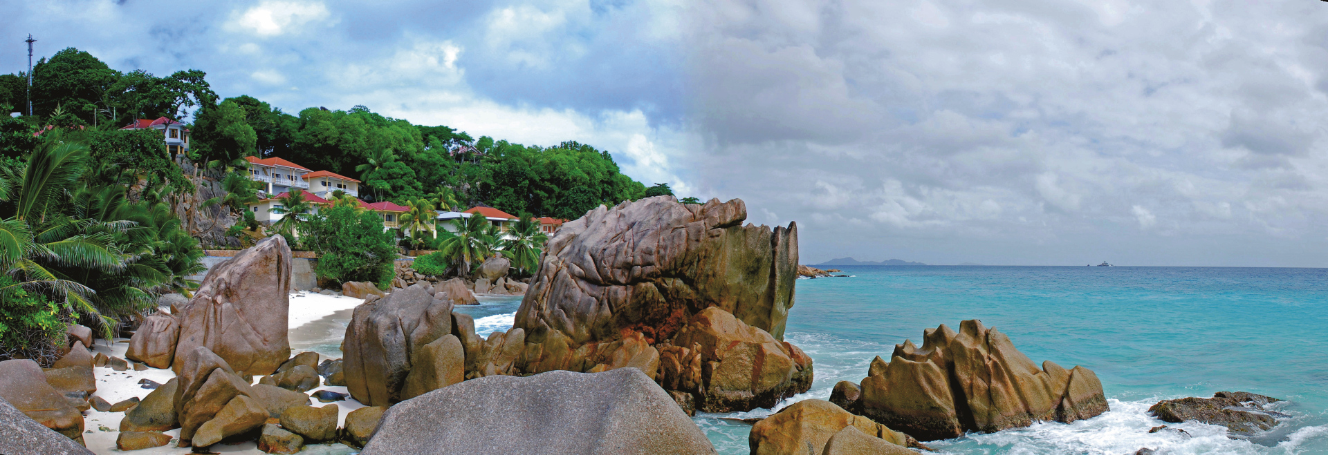 Hanglage an der nahezu unberührten Nordspitze von La Digue oberhalb der Anse Patates. Auf der anderen Seite liegt die Anse Severe.
