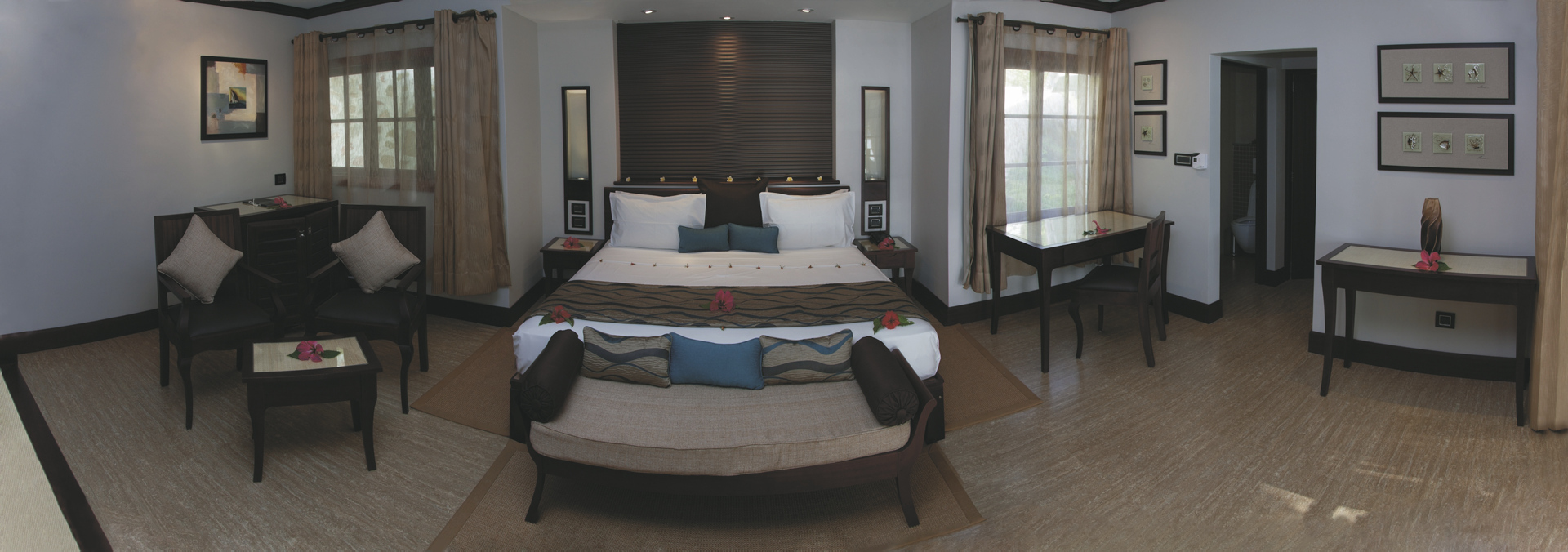 Die farbenfrohen und üppigen, tropischen Gärten mit Hibiskus- und Frangipani-Bäumen erreichen Sie über kleine Wege und Treppen. Der Strand des Hotels L'Archipel ist eines seiner spektakulärsten Attribute und steht ausschließlich seinen Gästen zur Verfügung. Er bietet ausgezeichnete Möglichkeiten zum Schwimmen, Schnorcheln und natürlich zum Sonnenbaden in einer traumhaften Umgebung.