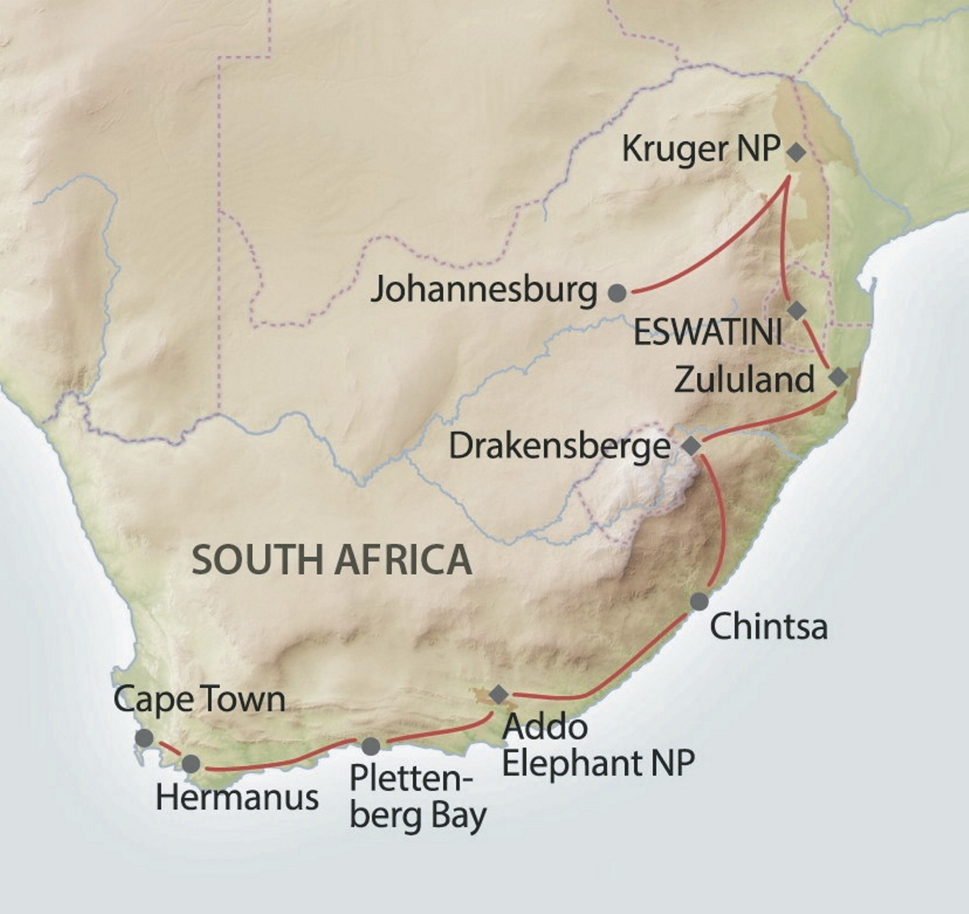 Bekommen Sie einen umfassenden Überblick über Südafrika und seine Nationalparks. In einer kleinen Gruppe Gleichgesinnter erleben Sie den Krüger Nationalpark, das kleine Königreich Eswatini, die Heimat der Zulu, das Wanderparadies Drakensberge, die weitgehend unberührte Wild Coast und den Garten Südafrikas - die Garden Route. Begegnungen mit der einheimischen Bevölkerung und deren Kultur sowie leichte Wanderungen bringen Ihnen das Land und seine Bewohner näher.