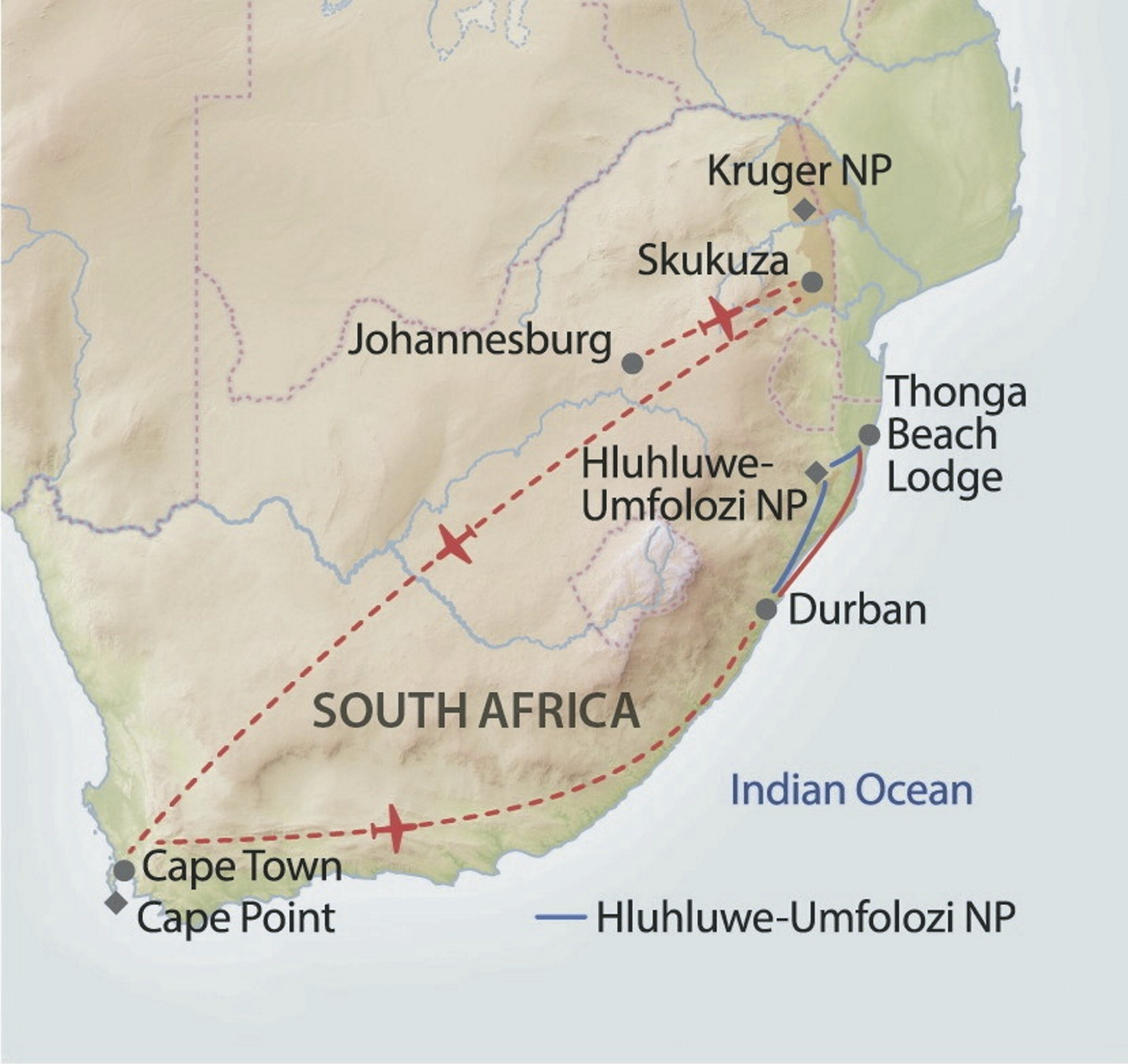 Auf dieser Reise kombinieren Sie spannenden Tiererlebnissen im Krüger Nationalpark mit dem wunderschönen Kapstadt und entspannen anschließend am Traumstrand in KwaZulu Natal. Ein Muss für Naturliebhaber! Hier erleben Sie unverfälschte und unberührte Natur. Wer mag kann noch eine viertägige Verlängerung im Hluhluwe-Umfolozi Game Reserve, einem der ältesten Parks des Landes und Heimat einer großen Nashorn-Population, dranhängen.