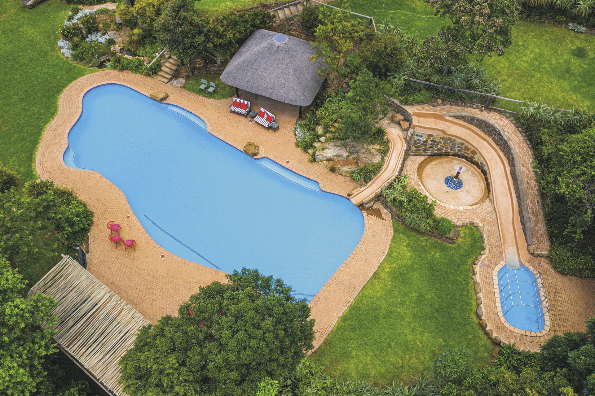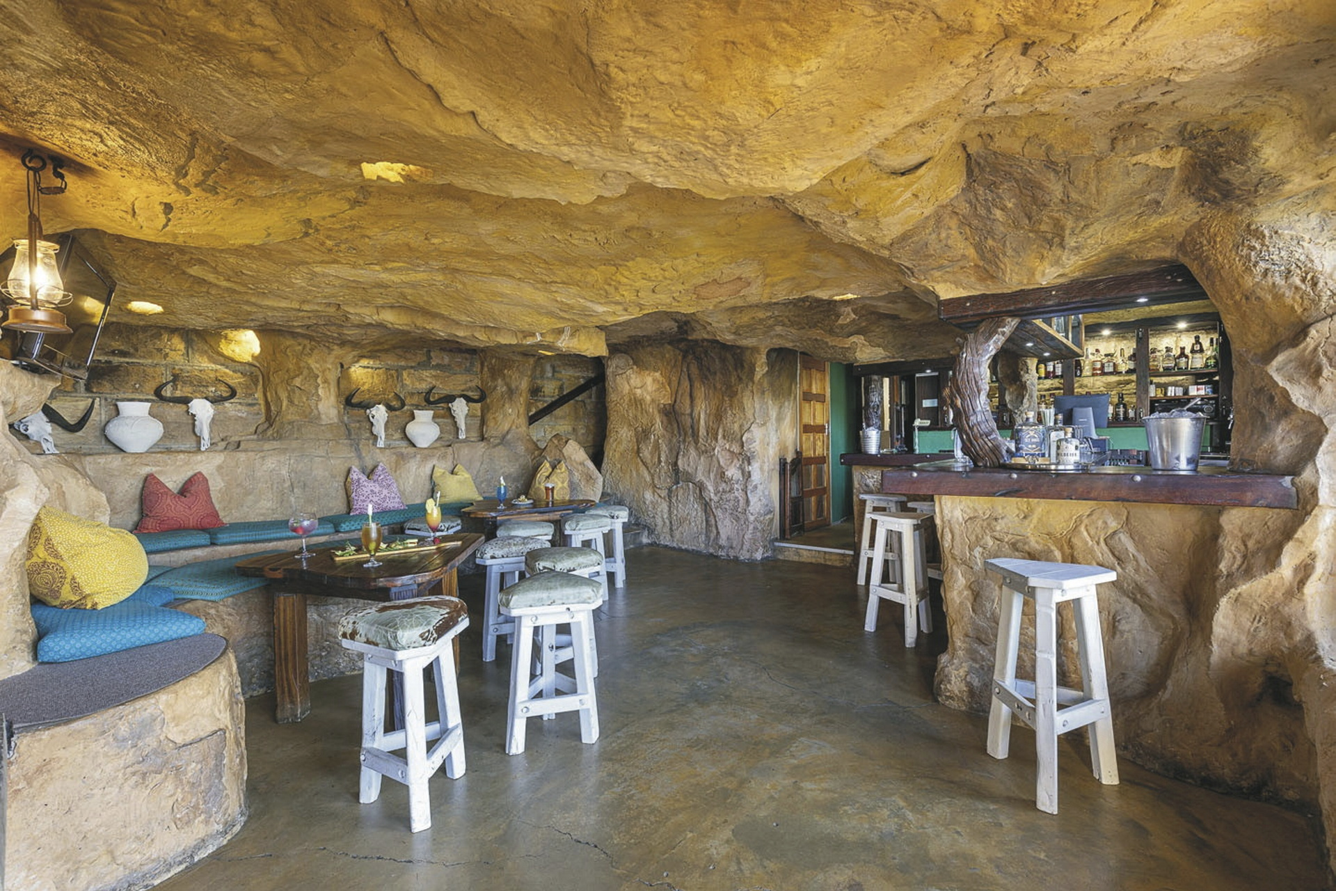 Das Familienresort wurde benannt nach der berüchtigten Kannibalenhöhle, die nicht weit entfernt liegt und mit ihren uralten Felszeichnungen der Buschmänner besichtigt werden kann. Auf dem weitläufigen Gelände liegen die Unterkünfte und der Spa-Bereich verstreut im Garten. Im zentralen Haupthaus erwartet Sie das Restaurant mit einer großen Terrasse, eine gemütliche Lounge mit Kamin - die Abende in den Bergen können frisch sein. Außerdem die sehr originelle Höhlen-Bar und der Weinkeller. Wenn Sie am Nachmittag von einer Wanderung zurückkommen steht ein kleiner Snack, Tee und Kaffee im Haupthaus bereit. Im Außenbereich gibt es eine Boma, in der bei gutem Wetter das Abendessen eingenommen werden kann, eine Tennisanlage, sowie ein großzügiger Pool mit Kinderbecken und Rutschen. Für die kleinen Gäste steht zusätzlich noch ein Spielplatz sowie Kinderspiel- und Speisezimmer zur Verfügung. Optionale Aktivitäten: Reitausflüge, geführte Wanderungen, auch zu den Buschmann-Malereien, markierte Wanderwege. An der Infotafel, am Aktivitäten-Schalter können Sie sich täglich für eine der geführten Wandertouren eintragen, über Tag können Sie hier auch Getränke erwerben.