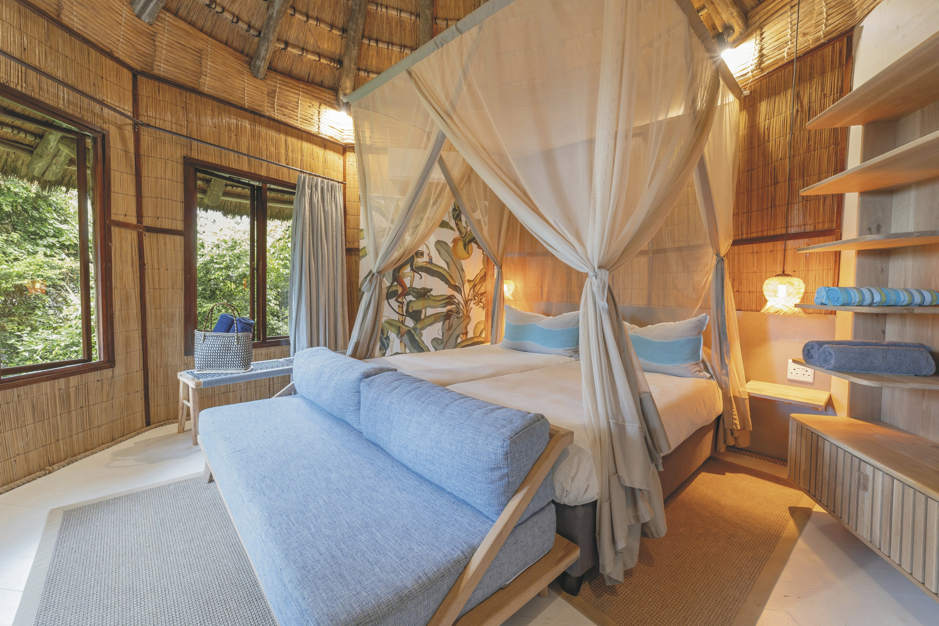 Es gibt 12 gemütliche Holzchalets, die eingebettet im Küstenwald liegen. Jedes mit offenem Bad, Balkon, Fön, Telefon, Minibar, Ventilator, Klimaanlage, Moskitonetz und Tee-/Kaffeezubereiter. 2 Chalets sind mit 2 Schlaf- und Badezimmern bestens für Familien geeignet. Die 3 Meerblick-Chalets (eingeschränkter Meerblick) liegen etwas erhöht an einem Hügel. Die 2 Deluxe-Chalets liegen noch höher und überblicken somit die komplette Vegetation und haben freie Sicht auf das Meer, außerdem zusätzlich eine Außendusche und auf der Terrasse einen privaten Plunge Pool. Ein Deluxe-Chalet ist ebenfalls für Familien geeignet.