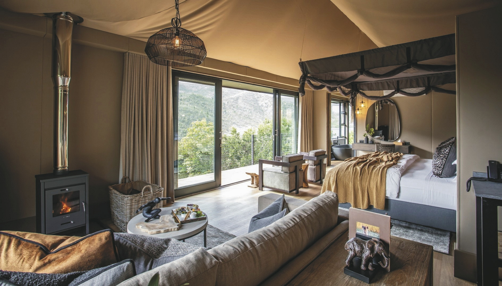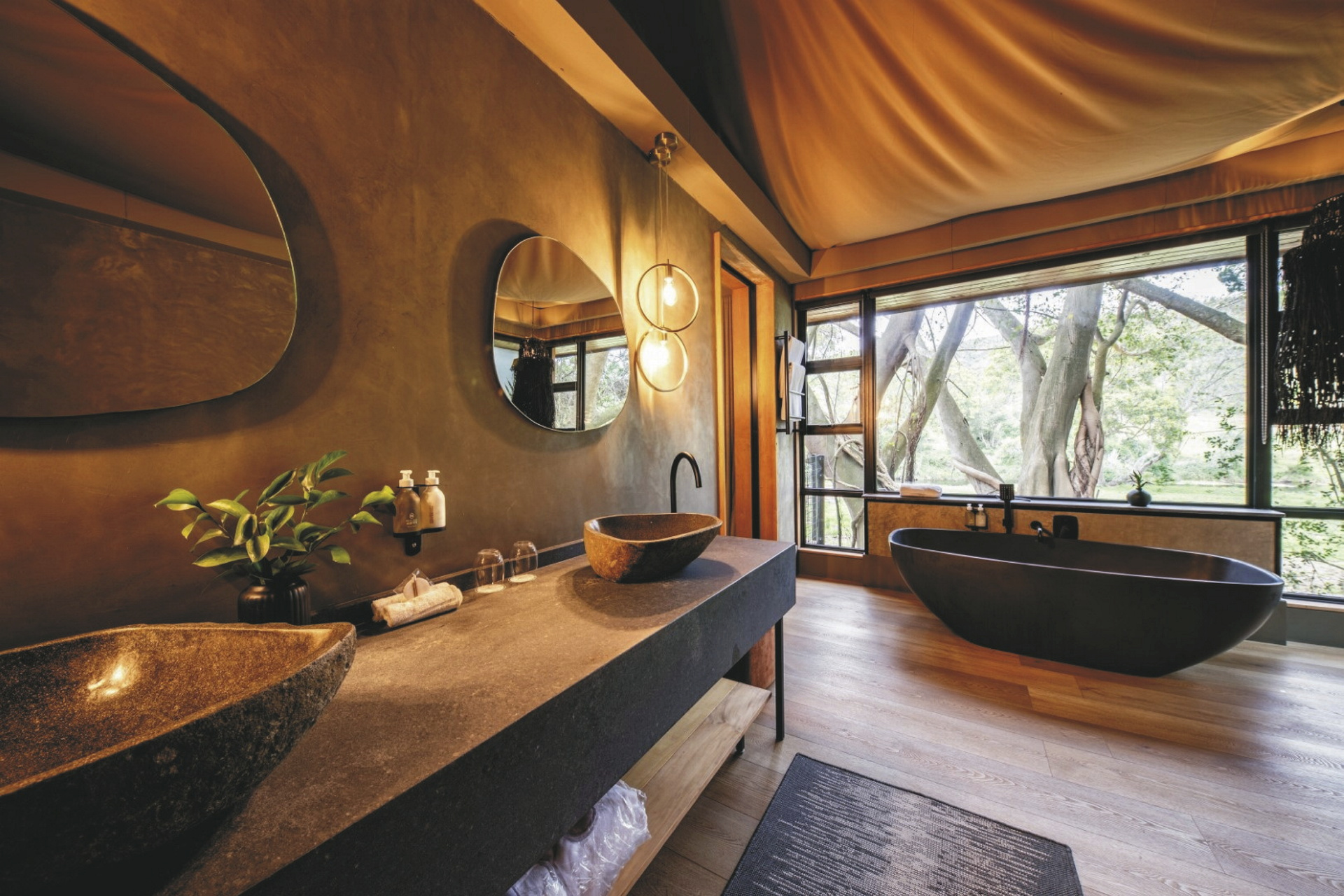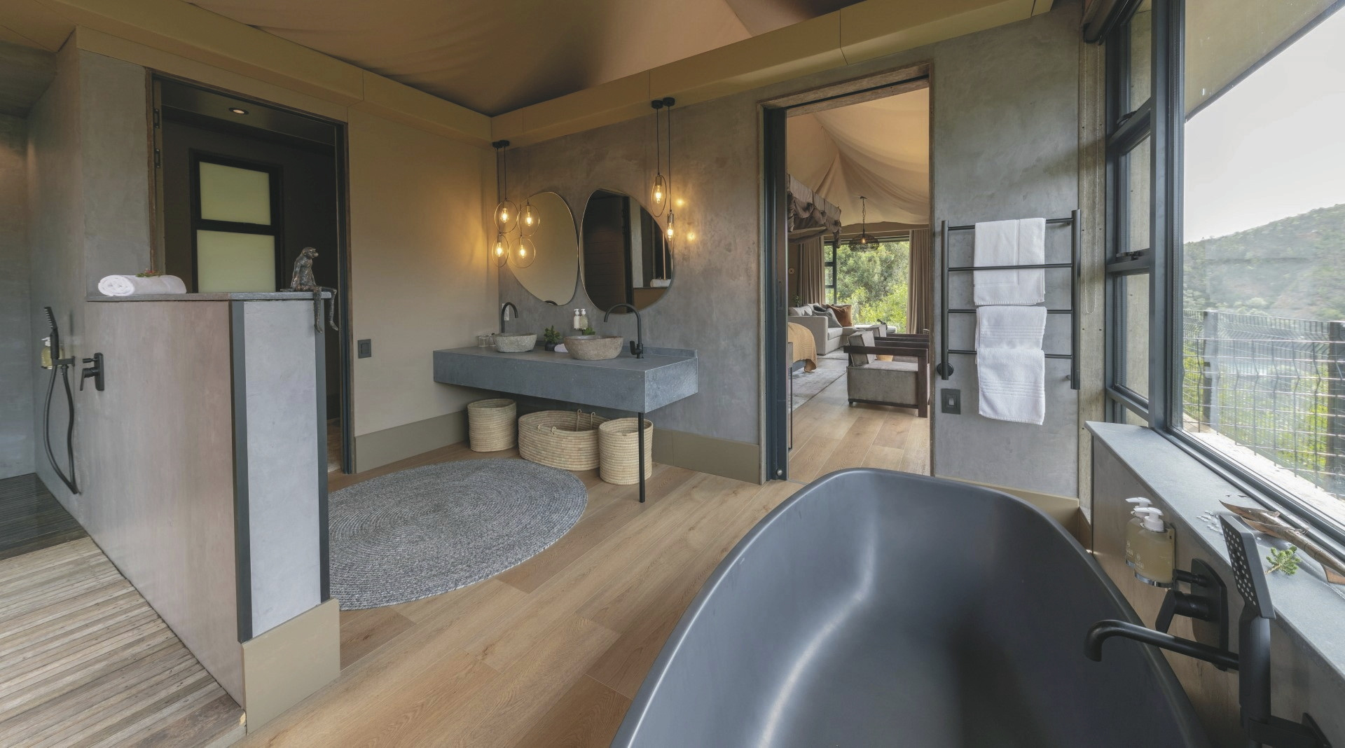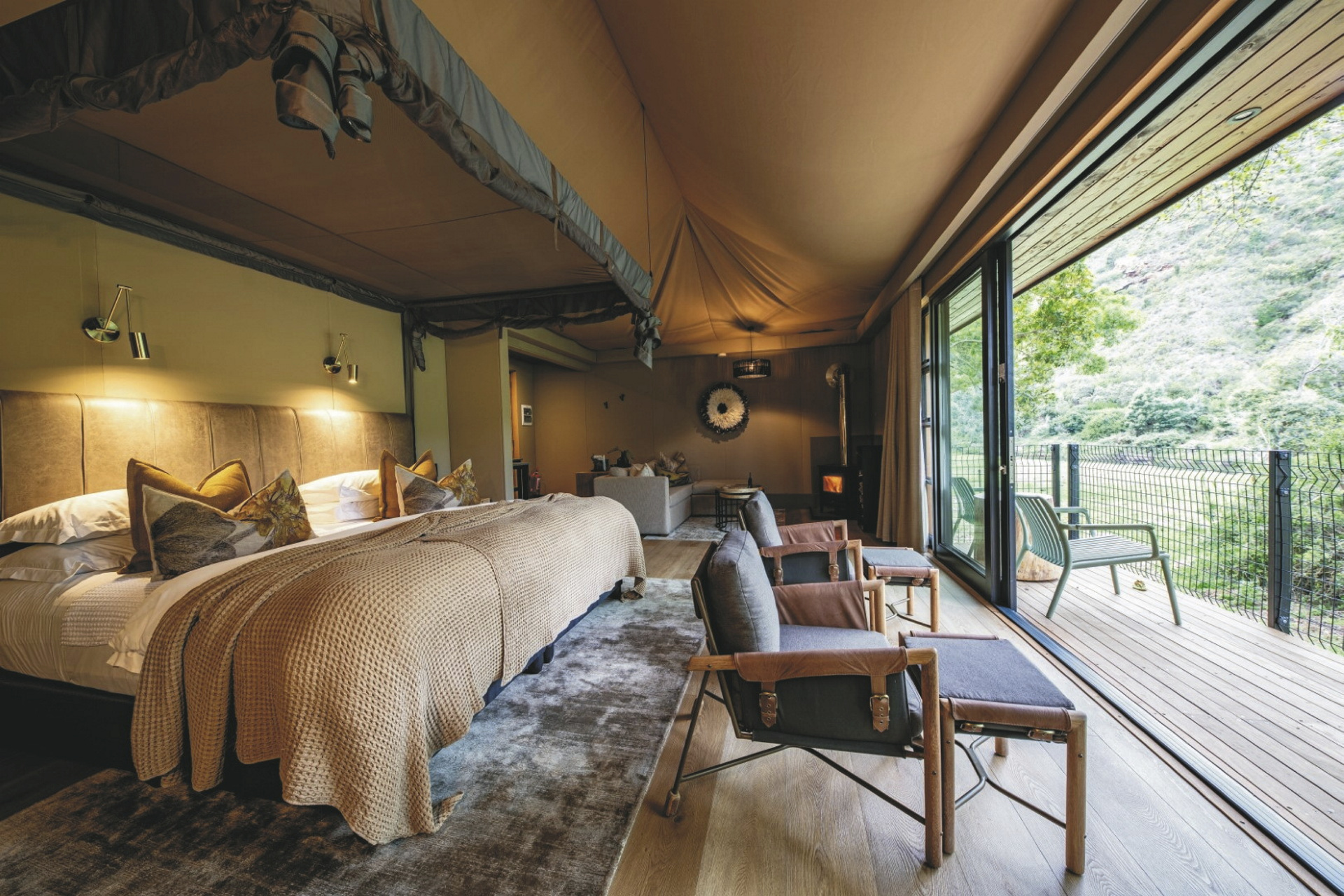 Die 29 großzügigen und luxuriös eingerichteten Safarizelte sind auf Holzterrassen gebaut und über Stege miteinander und dem Haupthaus verbunden. Jedes hat ein eigenes, offenes Bad mit Innen- und Außendusche, außerdem Moskitonetz, Minibar, Klimaanlage/Heizung, Tee-/Kaffeezubereiter, Fön, Safe, Telefon, eine gemütliche Lounge mit Kamin vervollständigen die Ausstattung. Die Superior-Zelte verfügen außerdem über ein TV. Die 6 Executive-Suiten mit Flussblick bieten zusätzlich einen Jacuzzi und ein Bett auf der Terrasse, wo Sie die Nacht unter dem Sternenhimmel verbringen können, diese Suite ist mit einer zusätzlichen Schlafcouch auch für Familien geeignet.
