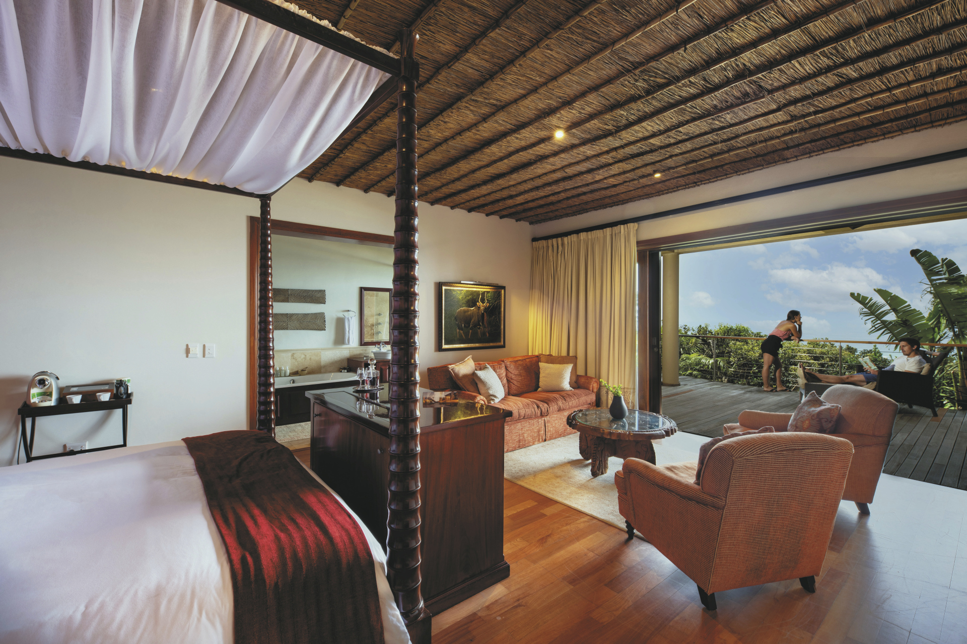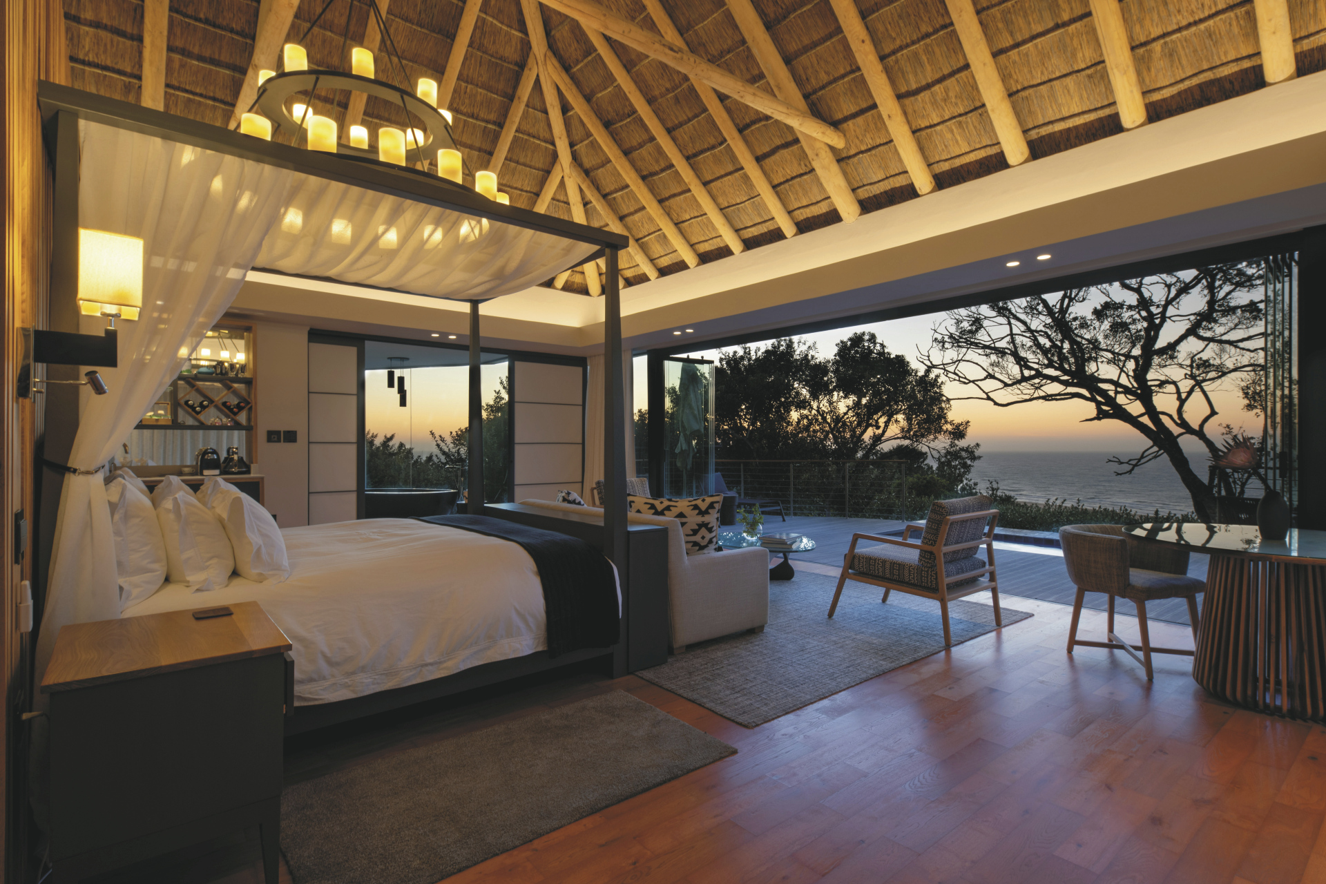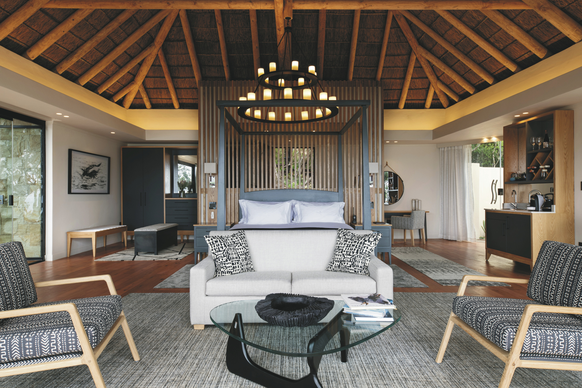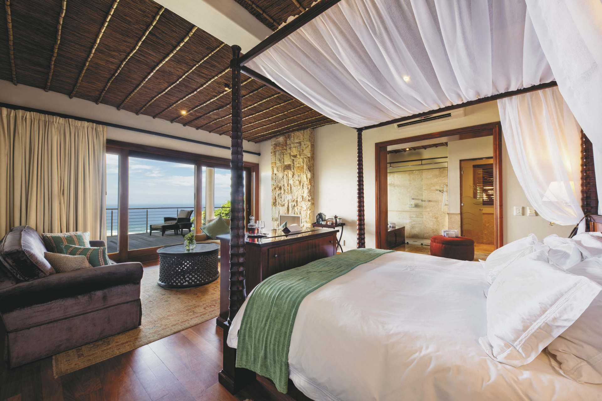 Die 3 etwas kleineren Lodge-Suiten befinden sich im Hauptgebäude. Die 4 Ocean-Suiten liegen ein wenig versteckt im Wald und bieten zwei Badezimmer, eines mit Dusche und eines mit einer Jacuzzi-Badewanne. Absolut exquisit sind die 2 Pool-Suiten mit einer zusätzlichen Außendusche, einem Plunge Pool, einem gemütlichen Tagesbett sowie einer Feuerstelle auf der Terrasse, und nicht zu vergessen die spektakuläre Aussicht über das Reservat bis zum Meer. Alle Suiten verfügen über ein helles Bad mit großen Panoramafenster vor der Badewanne und der Dusche, einen Loungebereich, Safe, TV, Minibar, Tee-/Kaffeezubereiter, kostenloses WLAN, Klimaanlage und eine große Terrasse. Die Fensterfront lässt nicht nur viel Licht in die Suiten, sie kann auch großzügig geöffnet werden und bieten so ein tolles Ambiente.