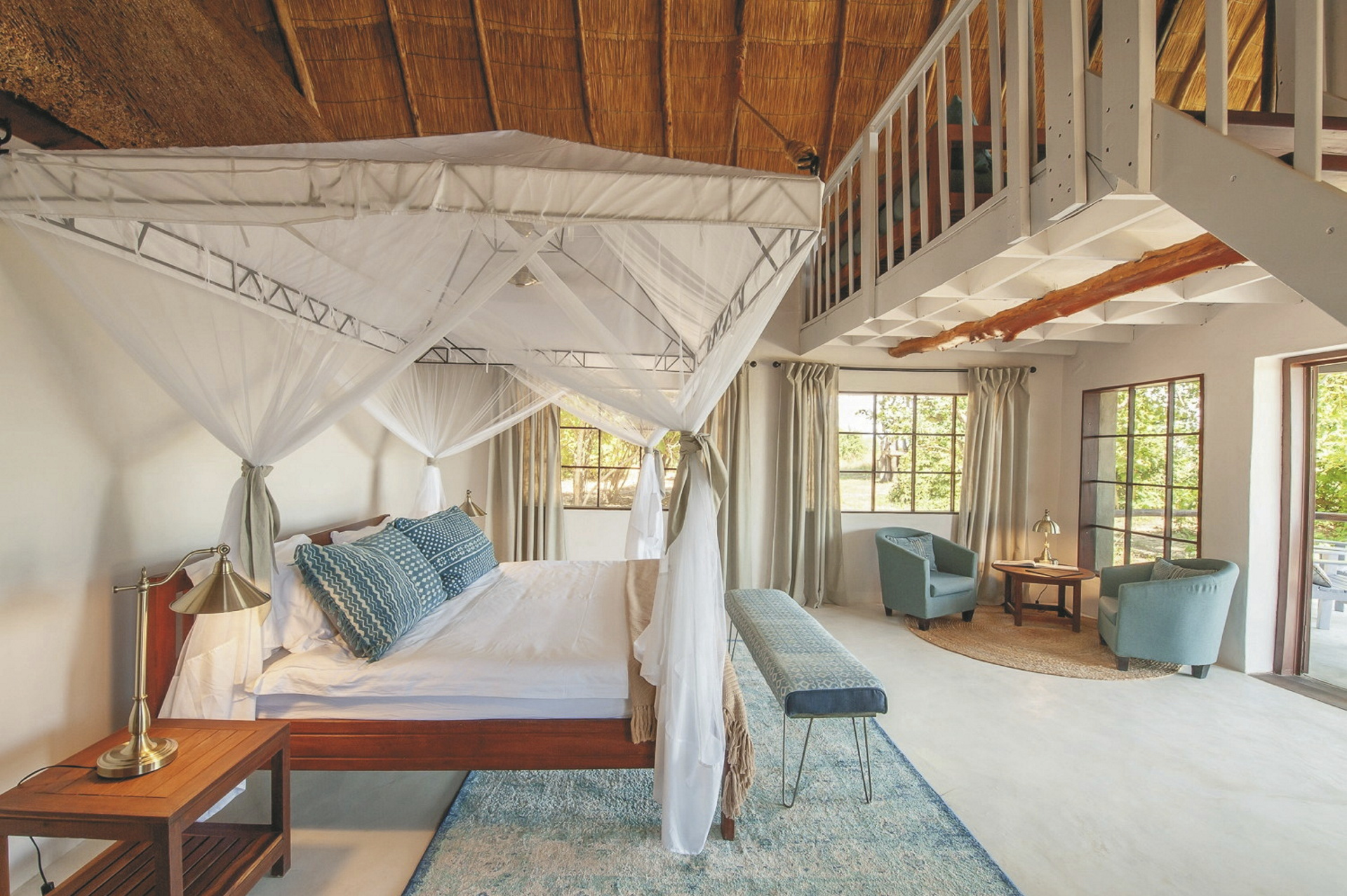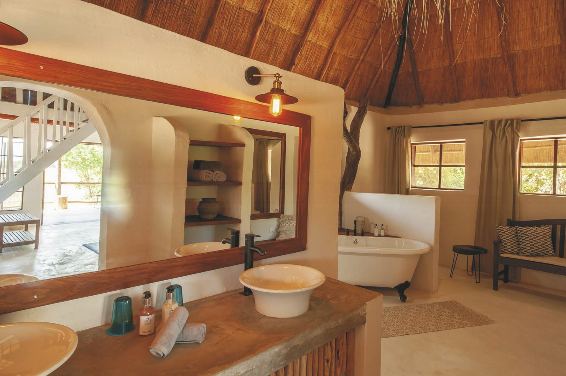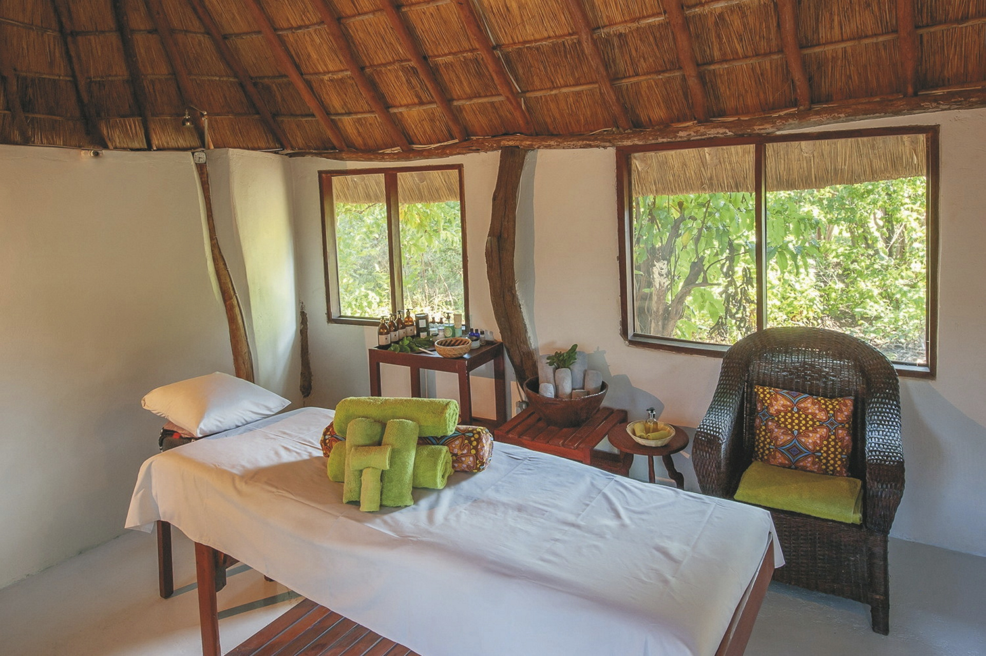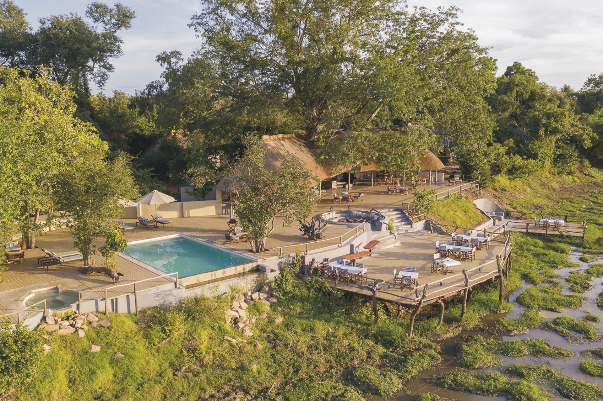 Der großzügige und moderne Hauptbereich verfügt über ein Restaurant, eine Bar, Sitzgruppen und eine Terrasse mit Feuerstelle und Blick auf die Überschwemmungsebenen. Für Entspannung sorgt der Pool nahe der Bar sowie das einzige natürliche Thermalbad im Luangwa-Tal. Dieser besondere Whirlpool wird von einer Quelle auf dem Gelände von Kafunta versorgt und bietet eine konstante Temperatur von 38 Grad. Eingeschlossene Aktivitäten: Pirschfahrten, Buschwanderungen und Dorfbesuche.