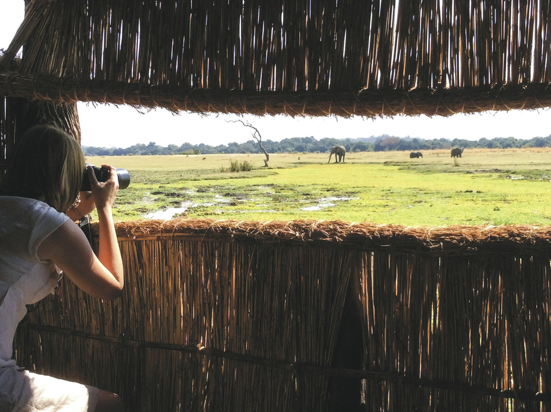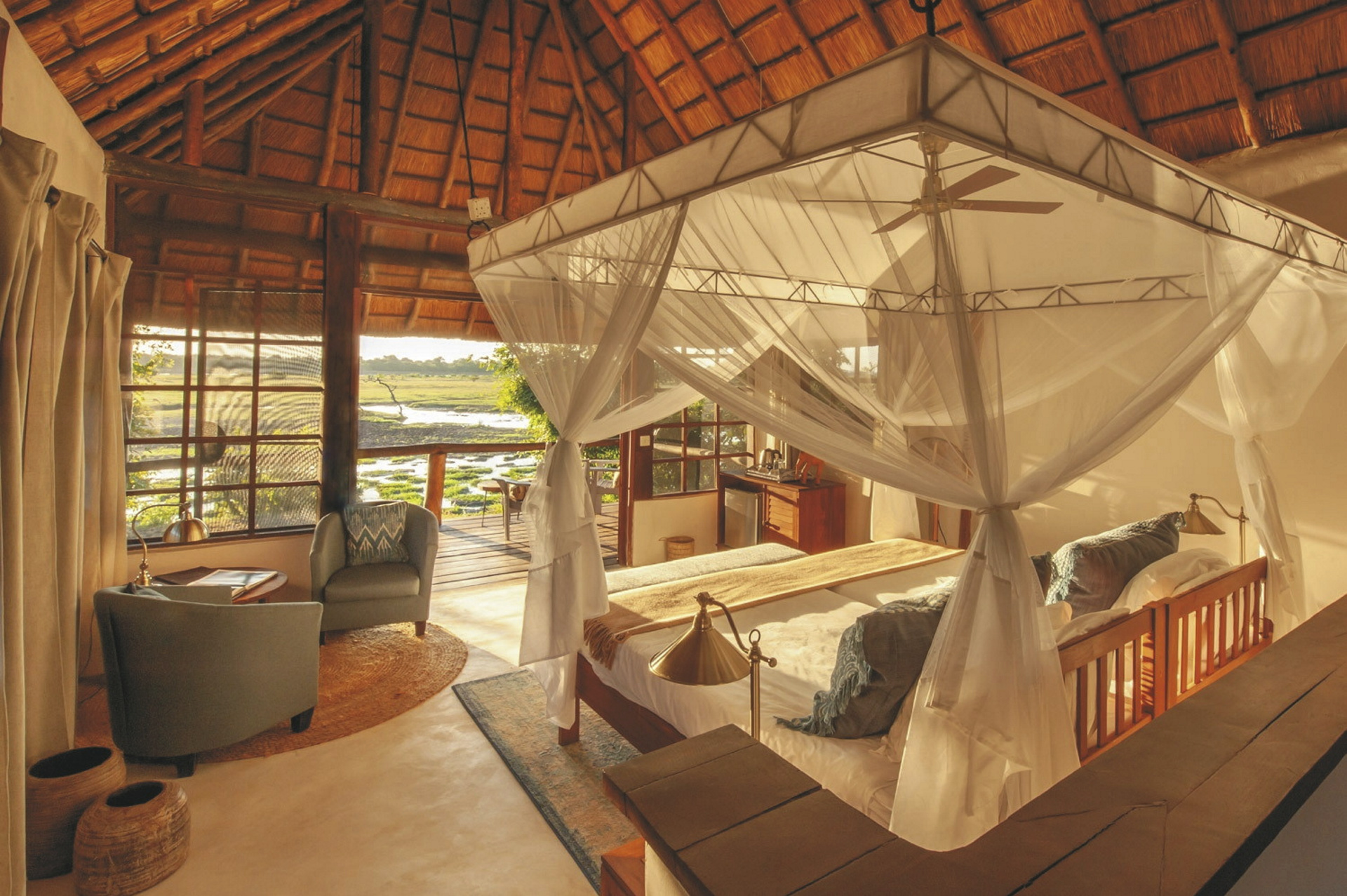 Die 8 riedgedeckten Chalets auf Holzplattformen und 2 Luxus-Suiten sind alle mit DU/WC, Minibar, Moskitonetz, Ventilator, Fön, Tee-/Kaffeezubereiter und elektrischem Licht ausgestattet. Die Terrasse bietet einen tollen Ausblick über die Überschwemmungsebene.